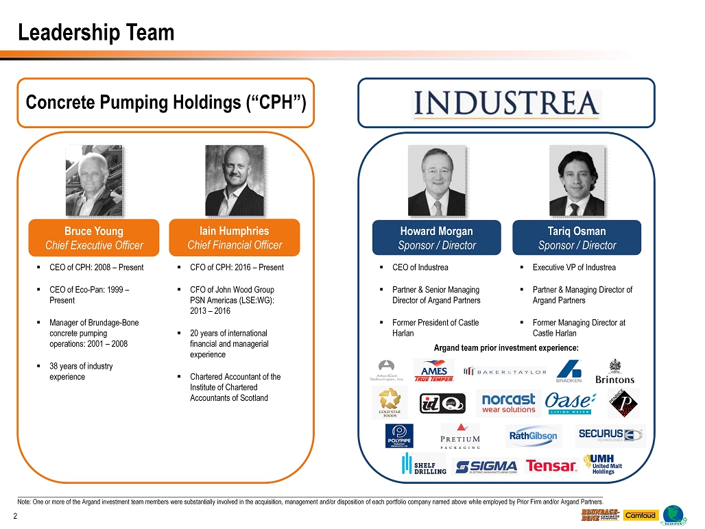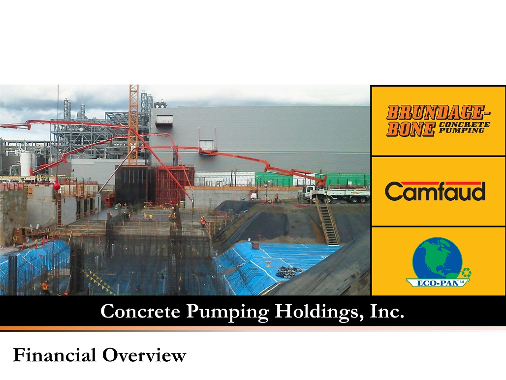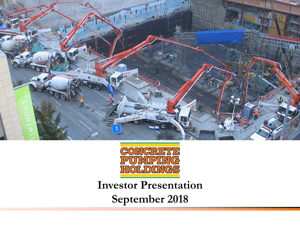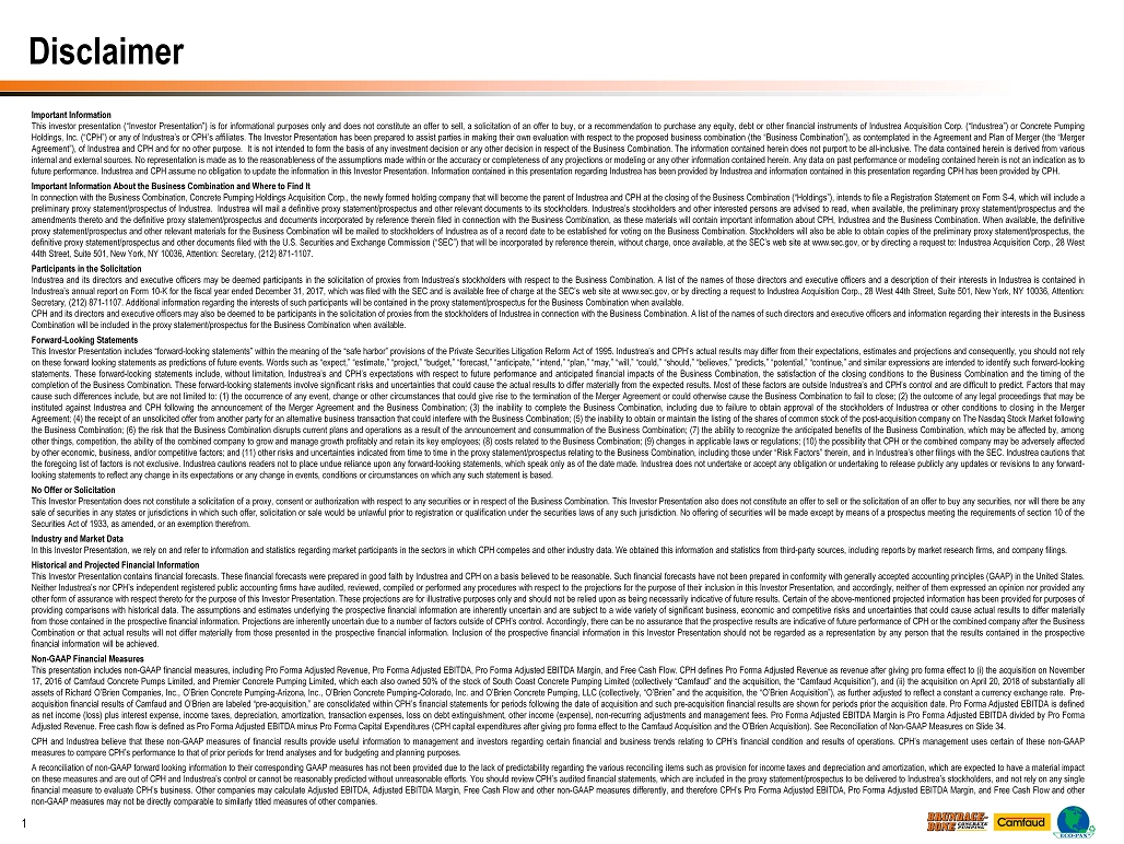 Important Information This investor presentation (“Investor Presentation”) is for informational purposes only and does not constitute an offer to sell, a solicitation of an offer to buy, or a recommendation to purchase any equity, debt or other financial instruments of Industrea Acquisition Corp . (“Industrea”) or Concrete Pumping Holdings, Inc . (“CPH”) or any of Industrea’s or CPH’s affiliates . The Investor Presentation has been prepared to assist parties in making their own evaluation with respect to the proposed business combination (the “Business Combination”), as contemplated in the Agreement and Plan of Merger (the “Merger Agreement”), of Industrea and CPH and for no other purpose . It is not intended to form the basis of any investment decision or any other decision in respect of the Business Combination . The information contained herein does not purport to be all - inclusive . The data contained herein is derived from various internal and external sources . No representation is made as to the reasonableness of the assumptions made within or the accuracy or completeness of any projections or modeling or any other information contained herein . Any data on past performance or modeling contained herein is not an indication as to future performance . Industrea and CPH assume no obligation to update the information in this Investor Presentation . Information contained in this presentation regarding Industrea has been provided by Industrea and information contained in this presentation regarding CPH has been provided by CPH . Important Information About the Business Combination and Where to Find It In connection with the Business Combination, Concrete Pumping Holdings Acquisition Corp . , the newly formed holding company that will become the parent of Industrea and CPH at the closing of the Business Combination (“Holdings”), intends to file a Registration Statement on Form S - 4 , which will include a preliminary proxy statement/prospectus of Industrea . Industrea will mail a definitive proxy statement/prospectus and other relevant documents to its stockholders . Industrea’s stockholders and other interested persons are advised to read, when available, the preliminary proxy statement/prospectus and the amendments thereto and the definitive proxy statement/prospectus and documents incorporated by reference therein filed in connection with the Business Combination, as these materials will contain important information about CPH, Industrea and the Business Combination . When available, the definitive proxy statement/prospectus and other relevant materials for the Business Combination will be mailed to stockholders of Industrea as of a record date to be established for voting on the Business Combination . Stockholders will also be able to obtain copies of the preliminary proxy statement/prospectus, the definitive proxy statement/prospectus and other documents filed with the U . S . Securities and Exchange Commission (“SEC”) that will be incorporated by reference therein, without charge, once available, at the SEC’s web site at www . sec . gov, or by directing a request to : Industrea Acquisition Corp . , 28 West 44 th Street, Suite 501 , New York, NY 10036 , Attention : Secretary, ( 212 ) 871 - 1107 . Participants in the Solicitation Industrea and its directors and executive officers may be deemed participants in the solicitation of proxies from Industrea’s stockholders with respect to the Business Combination . A list of the names of those directors and executive officers and a description of their interests in Industrea is contained in Industrea’s annual report on Form 10 - K for the fiscal year ended December 31 , 2017 , which was filed with the SEC and is available free of charge at the SEC’s web site at www . sec . gov, or by directing a request to Industrea Acquisition Corp . , 28 West 44 th Street, Suite 501 , New York, NY 10036 , Attention : Secretary, ( 212 ) 871 - 1107 . Additional information regarding the interests of such participants will be contained in the proxy statement/prospectus for the Business Combination when available . CPH and its directors and executive officers may also be deemed to be participants in the solicitation of proxies from the stockholders of Industrea in connection with the Business Combination . A list of the names of such directors and executive officers and information regarding their interests in the Business Combination will be included in the proxy statement/prospectus for the Business Combination when available . Forward - Looking Statements This Investor Presentation includes “forward - looking statements” within the meaning of the “safe harbor” provisions of the Private Securities Litigation Reform Act of 1995 . Industrea’s and CPH’s actual results may differ from their expectations, estimates and projections and consequently, you should not rely on these forward looking statements as predictions of future events . Words such as “expect,” “estimate,” “project,” “budget,” “forecast,” “anticipate,” “intend,” “plan,” “may,” “will,” “could,” “should,” “believes,” “predicts,” “potential,” “continue,” and similar expressions are intended to identify such forward - looking statements . These forward - looking statements include, without limitation, Industrea’s and CPH’s expectations with respect to future performance and anticipated financial impacts of the Business Combination, the satisfaction of the closing conditions to the Business Combination and the timing of the completion of the Business Combination . These forward - looking statements involve significant risks and uncertainties that could cause the actual results to differ materially from the expected results . Most of these factors are outside Industrea’s and CPH’s control and are difficult to predict . Factors that may cause such differences include, but are no