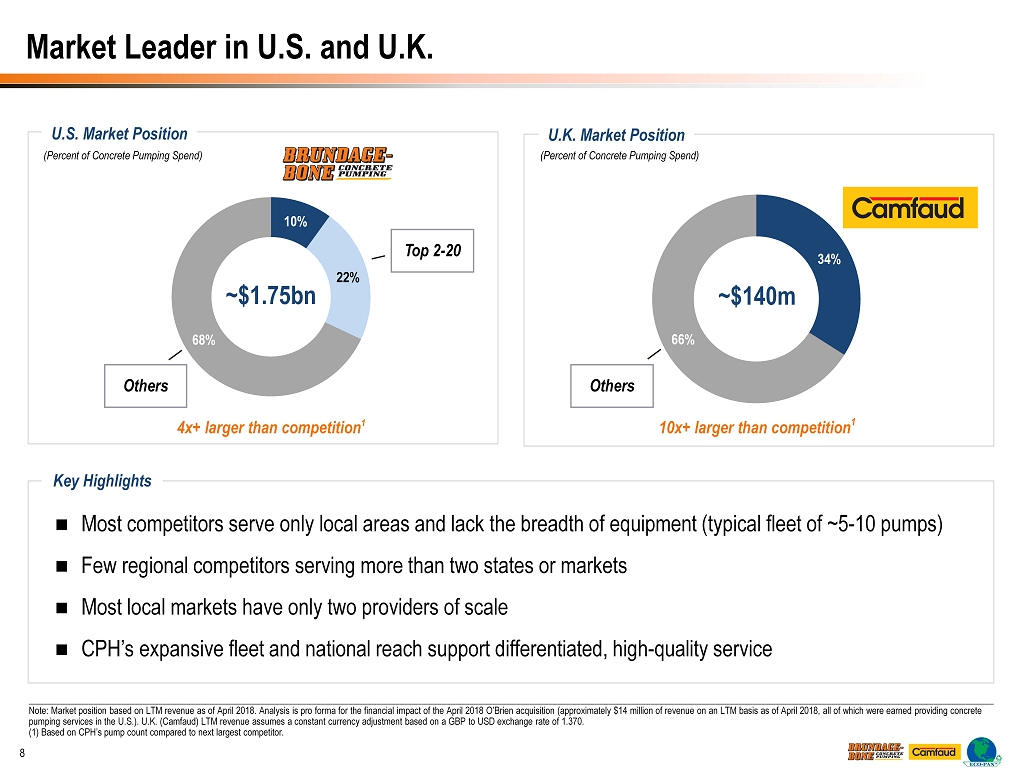 Concrete Pumping Gaining Share (% of total U.S. concrete placement that is pumped) Large, Growing Market Supported by Compelling Tailwinds U.S. Concrete Production (Millions of cubic yards) 396 406 390 404 431 458 457 415 352 259 257 266 290 300 325 336 351 351 '00 '01 '02 '03 '04 '05 '06 '07 '08 '09 '10 '11 '12 '13 '14 '15 '16 '17 Concrete production is ~23% below prior peak. Industry labor constraints extending recovery U.S. Pumped Concrete Demand 7 Pumping is taking share due to compelling customer value proposition 1 3 4 Pumping market expected to see strong pricing and volume growth Extended Construction Cycle Tax reform, regulatory relief and increased infrastructure spending extending the cycle 2 Early Mid Late New Position in Cycle Previous Position in Cycle ~20% ~34% 2000 2018 ~$1.75 billion ~$2.30 billion 2017 2021