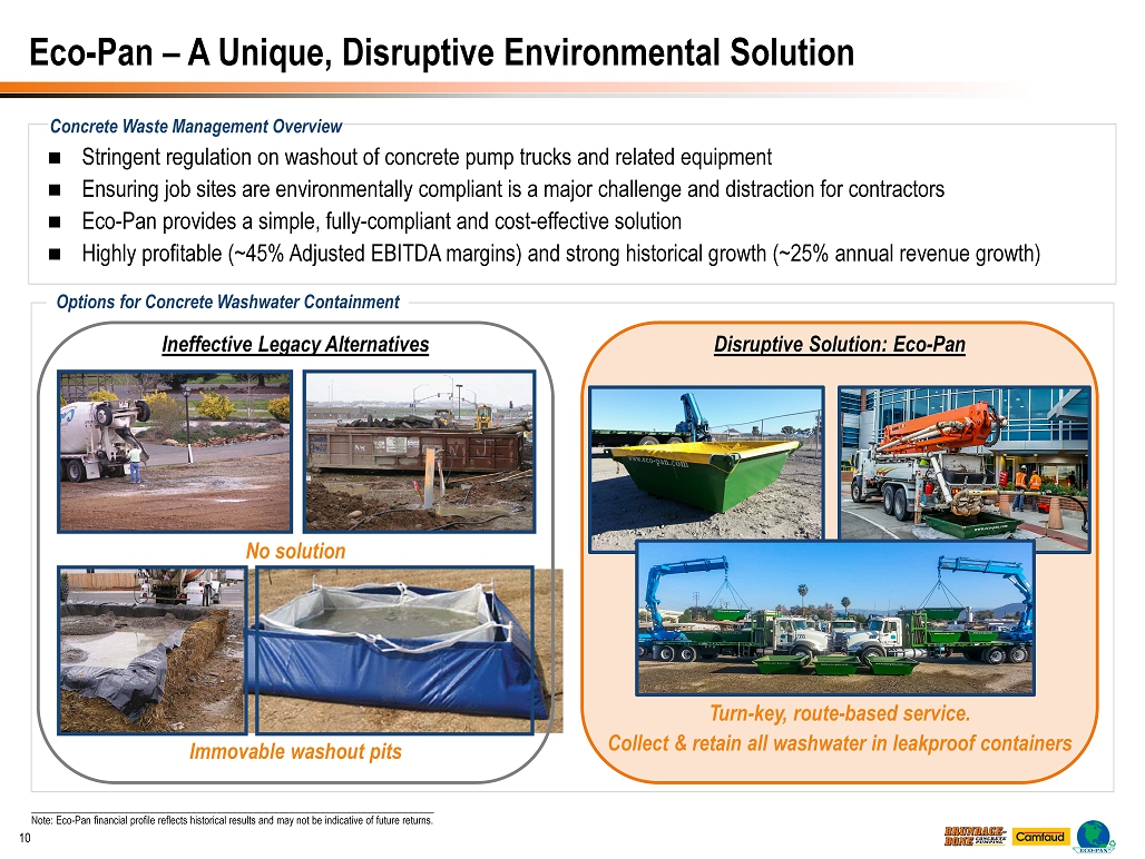Eco - Pan – A Unique, Disruptive Environmental Solution ______________________________________________________________________________ Note: Eco - Pan financial profile reflects historical results and may not be indicative of future returns. 10  Stringent regulation on washout of concrete pump trucks and related equipment  Ensuring job sites are environmentally compliant is a major challenge and distraction for contractors  Eco - Pan provides a simple, fully - compliant and cost - effective solution  Highly profitable (~45% Adjusted EBITDA margins) and strong historical growth (~25% annual revenue growth) Concrete Waste Management Overview Options for Concrete Washwater Containment Immovable washout pits Turn - key, route - based service. Collect & retain all washwater in leakproof containers No solution Ineffective Legacy Alternatives Disruptive Solution: Eco - Pan