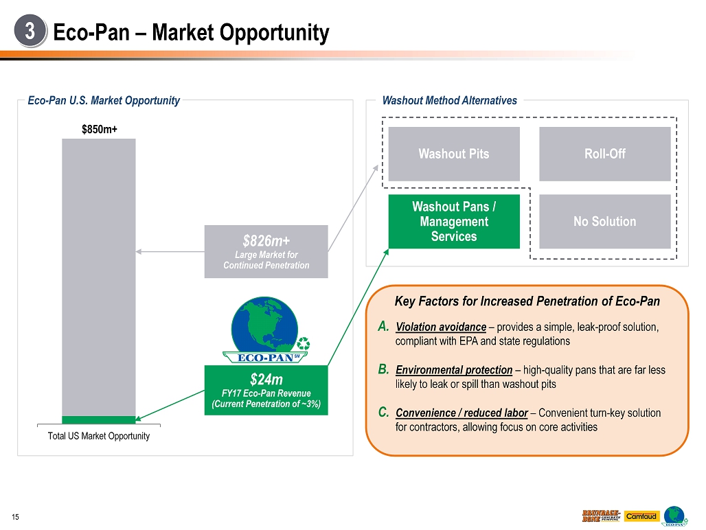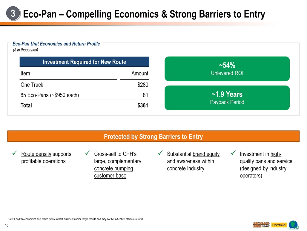 15 Eco - Pan – Market Opportunity 3 Eco - Pan U.S. Market Opportunity Total US Market Opportunity $850m+ $24m FY17 Eco - Pan Revenue (Current Penetration of ~3%) $826m+ Large Market for Continued Penetration Washout Method Alternatives Washout Pits Roll - Off No Solution Washout Pans / Management Services Key Factors for Increased Penetration of Eco - Pan A. Violation avoidance – provides a simple, leak - proof solution, compliant with EPA and state regulations B. Environmental protection – high - quality pans that are far less likely to leak or spill than washout pits C. Convenience / reduced labor – Convenient turn - key solution for contractors, allowing focus on core activities