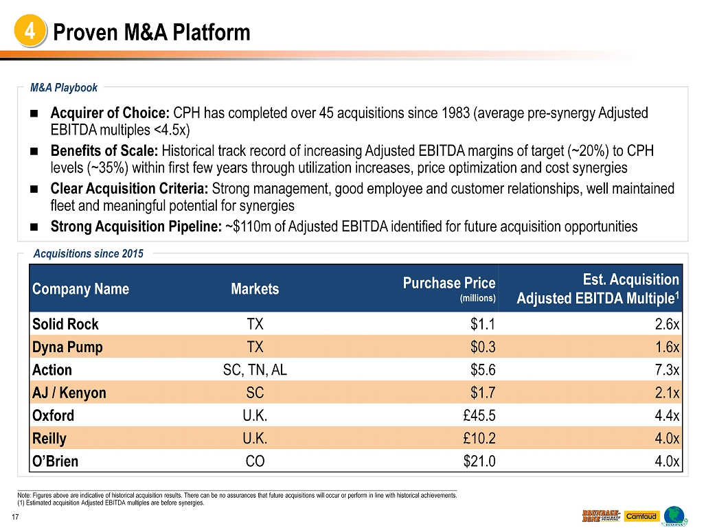 Proven M&A Platform 4 _____________________________________________________________________________________________________________________________ ___ __________ Note: Figures above are indicative of historical acquisition results. There can be no assurances that future acquisitions wil l o ccur or perform in line with historical achievements. (1) Estimated acquisition Adjusted EBITDA multiples are before synergies. 17 Company Name Markets Purchase Price (millions) Est. Acquisition Adjusted EBITDA Multiple 1 Solid Rock TX $1.1 2.6x Dyna Pump TX $0.3 1.6x Action SC, TN, AL $5.6 7.3x AJ / Kenyon SC $1.7 2.1x Oxford U.K. £ 45.5 4.4x Reilly U.K. £ 10.2 4.0x O’Brien CO $21.0 4.0x  Acquirer of Choice: CPH has completed over 45 acquisitions since 1983 (average pre - synergy Adjusted EBITDA multiples <4.5x)  Benefits of Scale: Historical track record of increasing Adjusted EBITDA margins of target (~20%) to CPH levels (~35%) within first few years through utilization increases, price optimization and cost synergies  Clear Acquisition Criteria: Strong management, good employee and customer relationships, well maintained fleet and meaningful potential for synergies  Strong Acquisition Pipeline: ~$110m of Adjusted EBITDA identified for future acquisition opportunities M&A Playbook Acquisitions since 2015