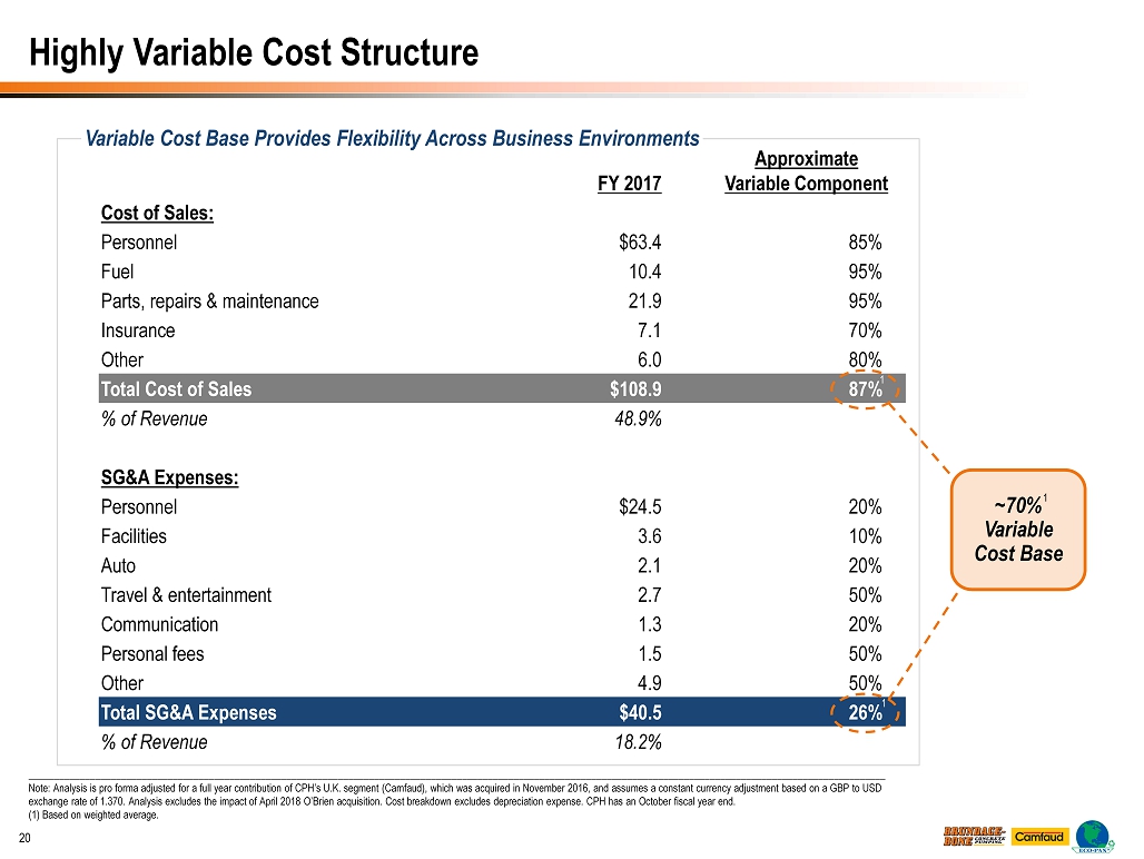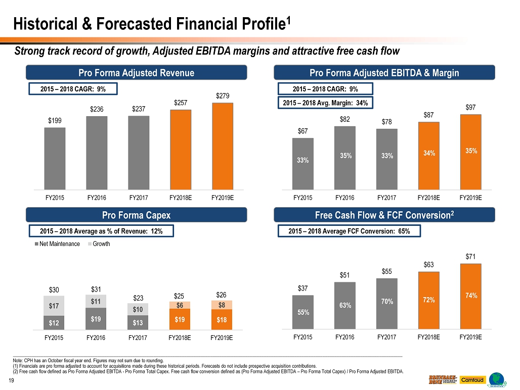 $12 $19 $13 $19 $18 $17 $11 $10 $6 $8 FY2015 FY2016 FY2017 FY2018E FY2019E Net Maintenance Growth _____________________________________________________________________________________________________________________________ ___ ______________________________________ Note: CPH has an October fiscal year end. Figures may not sum due to rounding. (1) Financials are pro forma adjusted to account for acquisitions made during these historical periods. Forecasts do not incl ude prospective acquisition contributions. (2) Free cash flow defined as Pro Forma Adjusted EBITDA - Pro Forma Total Capex. Free cash flow conversion defined as (Pro Forma Adjusted EBITDA – Pro Forma Total Capex) / Pro Forma Adjusted EBITDA. $37 $51 $55 $63 $71 FY2015 FY2016 FY2017 FY2018E FY2019E $67 $82 $78 $87 $97 FY2015 FY2016 FY2017 FY2018E FY2019E $199 $236 $237 $257 $279 FY2015 FY2016 FY2017 FY2018E FY2019E Pro Forma Adjusted Revenue Pro Forma Adjusted EBITDA & Margin Pro Forma Capex Free Cash Flow & FCF Conversion 2 2015 – 2018 CAGR: 9% 2015 – 2018 CAGR: 9% 2015 – 2018 Average as % of Revenue: 12% 2015 – 2018 Average FCF Conversion: 65% 33% 35% 33% 34% 35% Historical & Forecasted Financial Profile 1 19 63% 70% 72% 74% $31 $23 $25 $26 Strong track record of growth, Adjusted EBITDA margins and attractive free cash flow 2015 – 2018 Avg. Margin: 34% $30 55%
