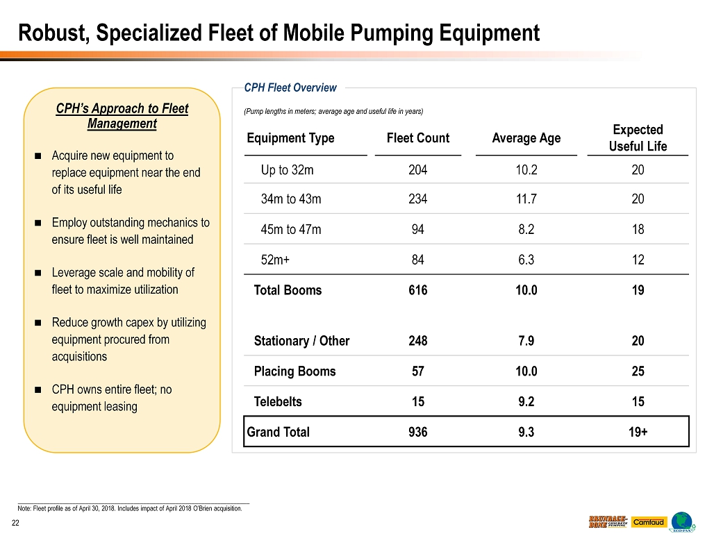 Strong Unit Economics Across Both Concrete Pumping and Eco - Pan 21 _____________________________________________________________________________________________________________________________ ___ ________________________________________________________ Note: Unit economics and return profile reflect historical and/or target results and may not be indicative of future returns. (1) Payback periods vary between the U.S. and the U.K. and by asset type. Concrete pumping payback periods are net of trade - in o r sale value for units sold at the end of their useful lives (typical salvage value of approximately 20%). Concrete Pumping Unit Economics Eco - Pan Unit Economics ~54% Unlevered ROI vs. ~25% Unlevered ROI vs. ~4 - 5 Years 1 Payback Period ~20 Years Useful Life of Assets ~1.9 Years Payback Period ~20 Years Useful Life of Assets