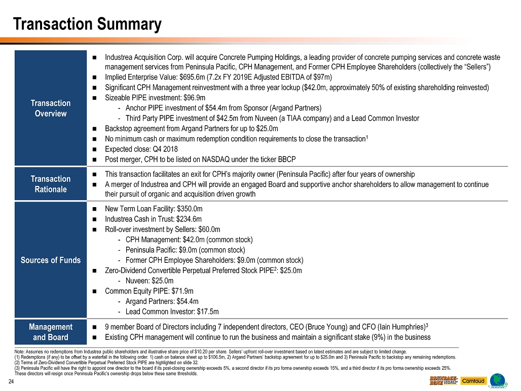 Transaction Overview  Industrea Acquisition Corp. will acquire Concrete Pumping Holdings, a leading provider of concrete pumping services and concrete waste management services from Peninsula Pacific, CPH Management, and Former CPH Employee Shareholders (collectively the “Sellers”)  Implied Enterprise Value: $695.6m (7.2x FY 2019E Adjusted EBITDA of $97m)  Significant CPH Management reinvestment with a three year lockup ($42.0m, approximately 50% of existing shareholding reinvest ed)  Sizeable PIPE investment: $96.9m - Anchor PIPE investment of $54.4m from Sponsor (Argand Partners) - Third Party PIPE investment of $42.5m from Nuveen (a TIAA company) and a Lead Common Investor  Backstop agreement from Argand Partners for up to $25.0m  No minimum cash or maximum redemption condition requirements to close the transaction 1  Expected close: Q4 2018  Post merger, CPH to be listed on NASDAQ under the ticker BBCP Transaction Rationale  This transaction facilitates an exit for CPH’s majority owner (Peninsula Pacific) after four years of ownership  A merger of Industrea and CPH will provide an engaged Board and supportive anchor shareholders to allow management to continu e their pursuit of organic and acquisition driven growth Sources of Funds  New Term Loan Facility: $350.0m  Industrea Cash in Trust: $234.6m  Roll - over investment by Sellers: $60.0m - CPH Management: $42.0m (common stock) - Peninsula Pacific: $9.0m (common stock) - Former CPH Employee Shareholders: $9.0m (common stock)  Zero - Dividend Convertible Perpetual Preferred Stock PIPE 2 : $25.0m - Nuveen: $25.0m  Common Equity PIPE: $71.9m - Argand Partners: $54.4m - Lead Common Investor: $17.5m Management and Board  9 member Board of Directors including 7 independent directors, CEO (Bruce Young) and CFO (Iain Humphries) 3  Existing CPH management will continue to run the business and maintain a significant stake (9%) in the business Transaction Summary _____________________________________________________________________________________________________________________________ ___ _____________________________________________________________ Note: Assumes no redemptions from Industrea public shareholders and illustrative share price of $10.20 per share. Sellers’ up fro nt roll - over investment based on latest estimates and are subject to limited change. (1) Redemptions (if any) to be offset by a waterfall in the following order: 1) cash on balance sheet up to $106.5m, 2) Argan d P artners’ backstop agreement for up to $25.0m and 3) Peninsula Pacific to backstop any remaining redemptions. (2) Terms of Zero - Dividend Convertible Perpetual Preferred Stock PIPE are highlighted on slide 32. (3) Peninsula Pacific will have the right to appoint one director to the board if its post - closing ownership exceeds 5%, a secon d director if its pro forma ownership exceeds 15%, and a third director if its pro forma ownership exceeds 25%. These directors will resign once Peninsula Pacific’s ownership drops below these same thresholds. 24