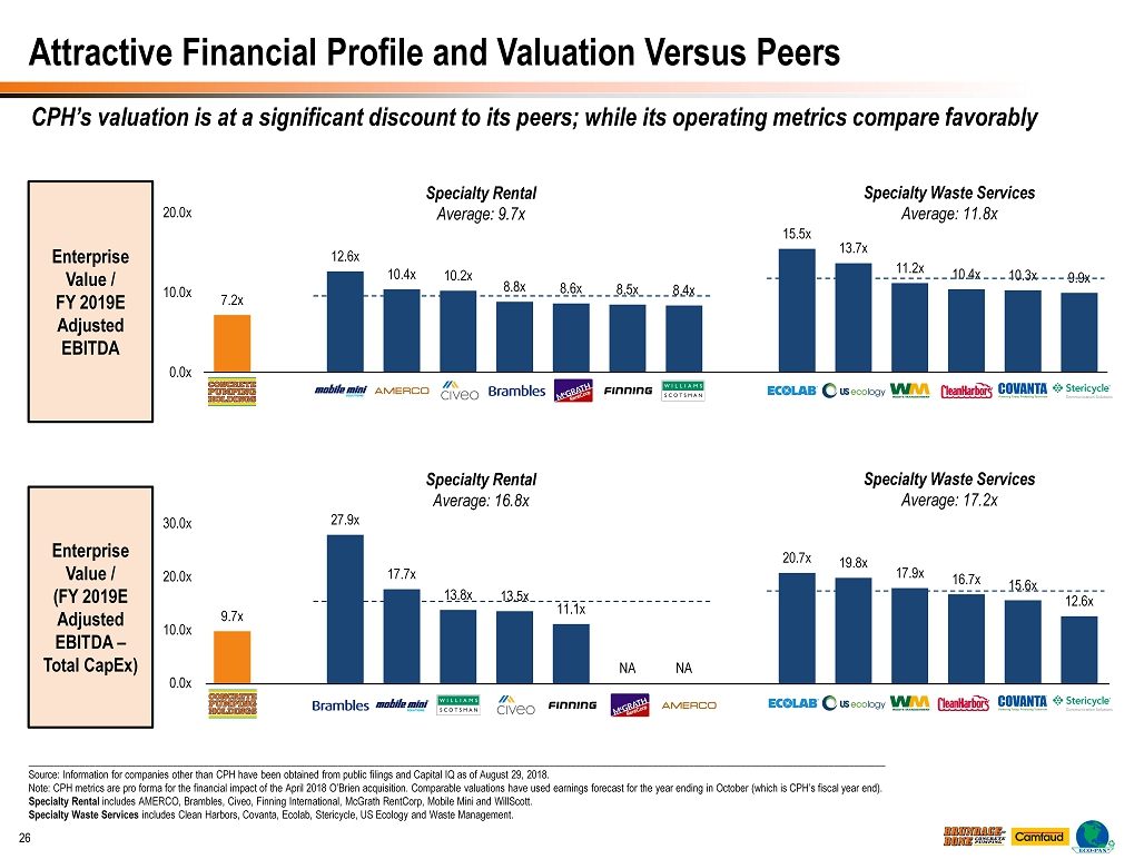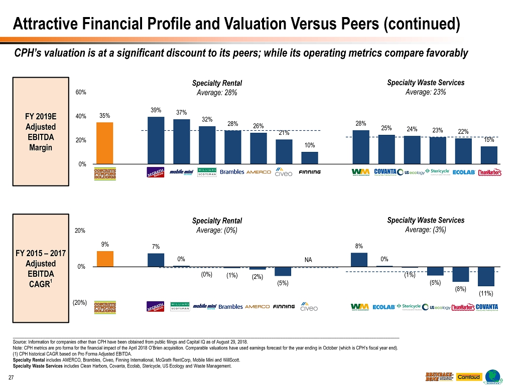 7.2x 12.6x 10.4x 10.2x 8.8x 8.6x 8.5x 8.4x 15.5x 13.7x 11.2x 10.4x 10.3x 9.9x 0.0x 10.0x 20.0x 9.7x 27.9x 17.7x 13.8x 13.5x 11.1x NA NA 20.7x 19.8x 17.9x 16.7x 15.6x 12.6x 0.0x 10.0x 20.0x 30.0x _____________________________________________________________________________________________________________________________ ___ ______________________________________ Source: Information for companies other than CPH have been obtained from public filings and Capital IQ as of August 29, 2018. Note: CPH metrics are pro forma for the financial impact of the April 2018 O’Brien acquisition. Comparable valuations have us ed earnings forecast for the year ending in October (which is CPH’s fiscal year end). Specialty Rental includes AMERCO, Brambles, Civeo, Finning International, McGrath RentCorp, Mobile Mini and WillScott. Specialty Waste Services includes Clean Harbors, Covanta, Ecolab, Stericycle, US Ecology and Waste Management. Enterprise Value / FY 2019E Adjusted EBITDA CPH’s valuation is at a significant discount to its peers; while its operating metrics compare favorably Attractive Financial Profile and Valuation Versus Peers Enterprise Value / (FY 2019E Adjusted EBITDA – Total CapEx) 26 Specialty Rental Average: 9.7x Specialty Waste Services Average: 11.8x Specialty Rental Average: 16.8x Specialty Waste Services Average: 17.2x
