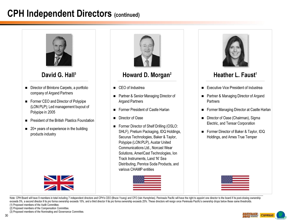  Former MD & CEO of Bradken (ASX:BKN); Led management buyout of Bradken in 2001  25+ years of management and leadership experience in raw material production and processing, supply and logistics and steel manufacturing Brian Hodges 2 CPH Independent Directors 29  Former CEO and President of Lafarge Corporation (NYSE:LAF)  Advisor and Board member of JMP Construction Materials since 2002  Former Non - Executive Chairman and Board member of U.S. Concrete  Former CEO of MMI Products  40+ years of management and leadership experience in the construction industry, both domestically and internationally John Piecuch 1 _____________________________________________________________________________________________________________________________ ___ _______________________________________________________________ Note: CPH Board will have 9 members in total including 7 independent directors and CPH’s CEO (Bruce Young) and CFO (Iain Hump hri es). Peninsula Pacific will have the right to appoint one director to the board if its post - closing ownership exceeds 5%, a second director if its pro forma ownership exceeds 15%, and a third director if its pro forma ownership exceeds 25 %. These directors will resign once Peninsula Pacific’s ownership drops below these same thresholds. (1) Proposed members of the Audit Committee. (2) Proposed members of the Compensation Committee. (3) Proposed members of the Nominating and Governance Committee.  Executive Vice President of Industrea  Partner & Managing Director of Argand Partners  Former Managing Director at Castle Harlan  Director of Sigma Electric (Chairman), Brintons Carpets (Chairman), and Gold Star Foods  Former Director of Shelf Drilling (OSLO:SHLF), Caribbean Restaurants, International Energy Services, the Blue Star Group, and Hercules Offshore (NASDAQ:HERO) Tariq Osman 2,3 Vice Chairman of Board  Chairman of the Board of Directors and Former President and CEO of Layne Christensen Co. (NASDAQ:LAYN)  Serves on the Board of the Directors for EMCOR Group (NYSE:EME) and Global Power Equipment Group (OTCMKTS:GLPW)  Former Chairman of the Board of Pride International (NYSE:PDE)  40+ years of construction and energy experience David A.B. Brown 1,3 Chairman of the Board