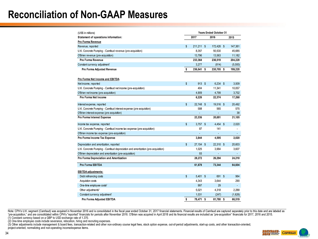 Reconciliation of Non - GAAP Measures 34 _____________________________________________________________________________________________________________________________ ___ __________________________________________________________________ Note: CPH’s U.K. segment (Camfaud) was acquired in November 2016 and is consolidated in the fiscal year ended October 31, 201 7 f inancial statements. Financial results of Camfaud are captured separately prior to this date and are labeled as “pre - acquisition,” and are consolidated within CPH’s "reported" financials for periods after November 2016. O'Brien was acquired in April 2018 and its financial results are included as “pre - acquisition” financials for 2017, 2016 and 2015. (1) Constant currency based on a GBP to USD exchange rate of 1.370. (2) One - time employee costs include severance, relocation, hiring and recruiting expenses. (3) Other adjustments include management & board fees, transaction - related and other non - ordinary course legal fees, stock optio n expense, out - of - period adjustments, start - up costs, and other transaction - oriented, project - oriented, normalizing and non - operating income/expense items. (US$ in millions) Statement of operations information: 2017 2016 2015 Pro Forma Revenue Revenue, reported $ 211,211 $ 172,426 $ 147,361 U.K. Concrete Pumping - Camfaud revenue (pre-acquisition) 8,357 50,530 45,685 O'Brien revenue (pre-acquisition) 13,796 13,563 11,182 Pro Forma Revenue 233,364 236,519 204,228 Constant currency adjustment 1 3,277 (814) (5,000) Pro Forma Adjusted Revenue $ 236,641 $ 235,705 $ 199,228 Pro Forma Net Income and EBITDA Net income, reported $ 913 $ 6,234 $ 3,509 U.K. Concrete Pumping - Camfaud net income (pre-acquisition) 404 11,341 10,057 O'Brien net income (pre-acquisition) 4,909 4,799 3,702 Pro Forma Net Income 6,226 22,374 17,268 Interest expense, reported $ 22,748 $ 19,516 $ 20,492 U.K. Concrete Pumping - Camfaud interest expense (pre-acquisition) 588 565 575 O'Brien interest expense (pre-acquisition) - - 38 Pro Forma Interest Expense 23,336 20,081 21,105 Income tax expense, reported $ 3,757 $ 4,454 $ 2,020 U.K. Concrete Pumping - Camfaud income tax expense (pre-acquisition) 87 141 - O'Brien income tax expense (pre-acquisition) - - - Pro Forma Income Tax Expense 3,844 4,595 2,020 Depreciation and amortization, reported $ 27,154 $ 22,310 $ 20,603 U.K. Concrete Pumping - Camfaud depreciation and amortization (pre-acquisition) 1,025 3,984 3,607 O'Brien depreciation and amortization (pre-acquisition) 93 - - Pro Forma Depreciation and Amortization 28,272 26,294 24,210 Pro Forma EBITDA 61,678 73,344 64,604 EBITDA adjustments: Debt refinancing costs $ 5,401 $ 691 $ 964 Acquistion costs 4,343 3,644 290 One-time employee costs 2 997 29 - Other adjustments 3 5,021 4,318 2,288 Constant currency adjustment 1 1,031 (247) (1,626) Pro Forma Adjusted EBITDA $ 78,471 $ 81,780 $ 66,519 Years Ended October 31