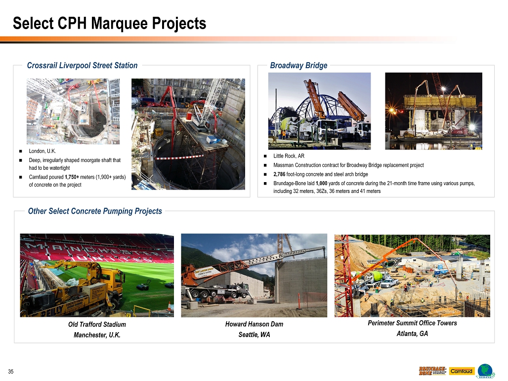 Select CPH Marquee Projects 35 Broadway Bridge Other Select Concrete Pumping Projects Crossrail Liverpool Street Station  Little Rock, AR  Massman Construction contract for Broadway Bridge replacement project  2,786 foot - long concrete and steel arch bridge  Brundage - Bone laid 1,000 yards of concrete during the 21 - month time frame using various pumps, including 32 meters, 36Zs, 36 meters and 41 meters  London, U.K.  Deep, irregularly shaped moorgate shaft that had to be watertight  Camfaud poured 1,750+ meters (1,900+ yards) of concrete on the project Howard Hanson Dam Seattle, WA Old Trafford Stadium Manchester, U.K. Perimeter Summit Office Towers Atlanta, GA