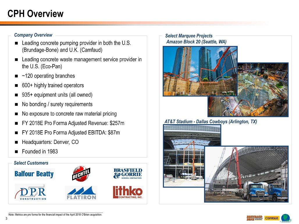 _____________________________________________________________________________________________________________________________ ___ ________________________________________________________ Note: One or more of the Argand investment team members were substantially involved in the acquisition, management and/or dis pos ition of each portfolio company named above while employed by Prior Firm and/or Argand Partners. Bruce Young Chief Executive Officer Howard Morgan Sponsor / Director ▪ CEO of CPH: 2008 – Present ▪ CEO of Eco - Pan: 1999 – Present ▪ Manager of Brundage - Bone concrete pumping operations: 2001 – 2008 ▪ 38 years of industry experience ▪ CFO of CPH: 2016 – Present ▪ CFO of John Wood Group PSN Americas (LSE:WG): 2013 – 2016 ▪ 20 years of international financial and managerial experience ▪ Chartered Accountant of the Institute of Chartered Accountants of Scotland ▪ CEO of Industrea ▪ Partner & Senior Managing Director of Argand Partners ▪ Former President of Castle Harlan ▪ Executive VP of Industrea ▪ Partner & Managing Director of Argand Partners ▪ Former Managing Director at Castle Harlan Argand team prior investment experience: Leadership Team Iain Humphries Chief Financial Officer Tariq Osman Sponsor / Director 2 Concrete Pumping Holdings (“CPH”)