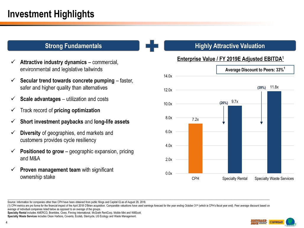 Company Overview CPH Overview Leading concrete pumping provider in both the U.S. (Brundage - Bone) and U.K. (Camfaud) Leading concrete waste management service provider in the U.S. (Eco - Pan) ~120 operating branches 600+ highly trained operators 935+ equipment units (all owned) No bonding / surety requirements No exposure to concrete raw material pricing FY 2018E Pro Forma Adjusted Revenue: $257m FY 2018E Pro Forma Adjusted EBITDA: $87m Headquarters: Denver, CO Founded in 1983 3 Select Customers Select Marquee Projects Amazon Block 20 (Seattle, WA) AT&T Stadium - Dallas Cowboys (Arlington, TX) ______________________________________________________________________ Note: Metrics are pro forma for the financial impact of the April 2018 O’Brien acquisition.