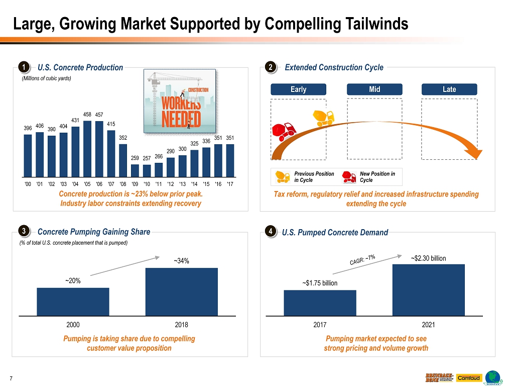 Significant Advantages of Concrete Pumping Crane & Bucket Wheel - barrow Concrete Placement Methods Tailgating Speed and Efficiency Access / Precision of Placement Safety Consistent Placement Advantages of Concrete Pumping ____________________________________________________________________________________________ (1) Figures do not sum to 100% as ‘other methods’ (i.e. pre - cast concrete) account for a further 10% of the market. 6 Comparable All - In Cost % of U.S. Market 1 45% 9% 2% Pumping 34%