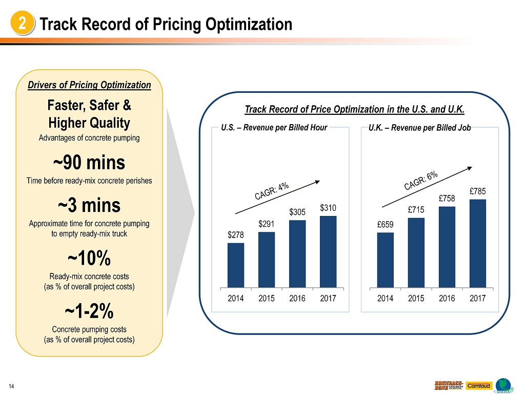 Massive Infrastructure Opportunity in the U.S. and U.K. 13 $77 billion HS2 project to begin autumn 2018 Highly concrete intensive, with a very large percentage requiring pumping CPH’s U.K. segment (Camfaud) is well positioned to receive a large share given its national footprint and fleet capabilities Expected Contribution – Phase 1 Only: – ~5.4 million m 3 of concrete and ~2.2 million m 3 of that concrete will be pumped – Phase 1 market opportunity for Camfaud could be worth up to $24 million _______________________________________________________________________________________________________________ (1) American Society of Civil Engineers “2017 Infrastructure Report Card: A Comprehensive Assessment of America’s Infrastruct ure ”. U.K. High Speed Railway Project (“HS2”) Manchester Birmingham London Leeds Sheffield Key HS2 Phase 1 HS2 Phase 2 Project Overview U.S. State Infrastructure Report and Grading 1 U.S. Infrastructure Report and Grading 1 1 Category Grade 1 Aviation D 2 Bridges C+ 3 Damns D 4 Drinking Water D 5 Energy D+ 6 Hazardous Waste D+ 7 Inland Waterways D 8 Levees D 9 Parks & Recreation D+ 10 Ports C+ 11 Rail B 12 Roads D 13 Schools D+ 14 Solid Waste C+ 15 Transit D - 16 Wastewater D+ Overall D+ Significant investment ($1+ trillion over ten years) expected to address aging and poor state of U.S. infrastructure Brundage - Bone’s footprint and operational capabilities position it well to capture a large share of stimulus spend U.S. Infrastructure Stimulus Opportunity