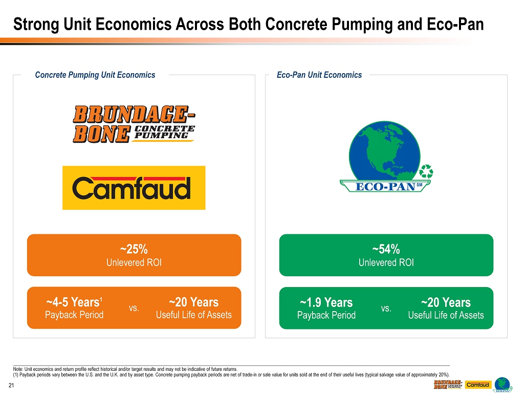 Strong Unit Economics Across Both Concrete Pumping and Eco - Pan 21 _____________________________________________________________________________________________________________________________ ___ ________________________________________________________ Note: Unit economics and return profile reflect historical and/or target results and may not be indicative of future returns. (1) Payback periods vary between the U.S. and the U.K. and by asset type. Concrete pumping payback periods are net of trade - in o r sale value for units sold at the end of their useful lives (typical salvage value of approximately 20%). Concrete Pumping Unit Economics Eco - Pan Unit Economics ~54% Unlevered ROI vs. ~25% Unlevered ROI vs. ~4 - 5 Years 1 Payback Period ~20 Years Useful Life of Assets ~1.9 Years Payback Period ~20 Years Useful Life of Assets