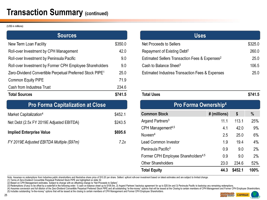 Transaction Overview Industrea Acquisition Corp. will acquire Concrete Pumping Holdings, a leading provider of concrete pumping services and concrete waste management services from Peninsula Pacific, CPH Management, and Former CPH Employee Shareholders (collectively the “Sellers”) Implied Enterprise Value: $695.6m (7.2x FY 2019E Adjusted EBITDA of $97m) Significant CPH Management reinvestment with a three year lockup ($42.0m, approximately 50% of existing shareholding reinvest ed) Sizeable PIPE investment: $96.9m - Anchor PIPE investment of $54.4m from Sponsor (Argand Partners) - Third Party PIPE investment of $42.5m from Nuveen (a TIAA company) and a Lead Common Investor Backstop agreement from Argand Partners for up to $25.0m No minimum cash or maximum redemption condition requirements to close the transaction 1 Expected close: Q4 2018 Post merger, CPH to be listed on NASDAQ under the ticker BBCP Transaction Rationale This transaction facilitates an exit for CPH’s majority owner (Peninsula Pacific) after four years of ownership A merger of Industrea and CPH will provide an engaged Board and supportive anchor shareholders to allow management to continu e their pursuit of organic and acquisition driven growth Sources of Funds New Term Loan Facility: $350.0m Industrea Cash in Trust: $234.6m Roll - over investment by Sellers: $60.0m - CPH Management: $42.0m (common stock) - Peninsula Pacific: $9.0m (common stock) - Former CPH Employee Shareholders: $9.0m (common stock) Zero - Dividend Convertible Perpetual Preferred Stock PIPE 2 : $25.0m - Nuveen: $25.0m Common Equity PIPE: $71.9m - Argand Partners: $54.4m - Lead Common Investor: $17.5m Management and Board 9 member Board of Directors including 7 independent directors, CEO (Bruce Young) and CFO (Iain Humphries) 3 Existing CPH management will continue to run the business and maintain a significant stake (9%) in the business Transaction Summary _____________________________________________________________________________________________________________________________ ___ _____________________________________________________________ Note: Assumes no redemptions from Industrea public shareholders and illustrative share price of $10.20 per share. Sellers’ up fro nt roll - over investment based on latest estimates and are subject to limited change. (1) Redemptions (if any) to be offset by a waterfall in the following order: 1) cash on balance sheet up to $106.5m, 2) Argan d P artners’ backstop agreement for up to $25.0m and 3) Peninsula Pacific to backstop any remaining redemptions. (2) Terms of Zero - Dividend Convertible Perpetual Preferred Stock PIPE are highlighted on slide 32. (3) Peninsula Pacific will have the right to appoint one director to the board if its post - closing ownership exceeds 5%, a secon d director if its pro forma ownership exceeds 15%, and a third director if its pro forma ownership exceeds 25%. These directors will resign once Peninsula Pacific’s ownership drops below these same thresholds. 24