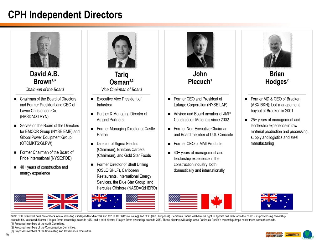 Former MD & CEO of Bradken (ASX:BKN); Led management buyout of Bradken in 2001 25+ years of management and leadership experience in raw material production and processing, supply and logistics and steel manufacturing Brian Hodges 2 CPH Independent Directors 29 Former CEO and President of Lafarge Corporation (NYSE:LAF) Advisor and Board member of JMP Construction Materials since 2002 Former Non - Executive Chairman and Board member of U.S. Concrete Former CEO of MMI Products 40+ years of management and leadership experience in the construction industry, both domestically and internationally John Piecuch 1 _____________________________________________________________________________________________________________________________ ___ _______________________________________________________________ Note: CPH Board will have 9 members in total including 7 independent directors and CPH’s CEO (Bruce Young) and CFO (Iain Hump hri es). Peninsula Pacific will have the right to appoint one director to the board if its post - closing ownership exceeds 5%, a second director if its pro forma ownership exceeds 15%, and a third director if its pro forma ownership exceeds 25 %. These directors will resign once Peninsula Pacific’s ownership drops below these same thresholds. (1) Proposed members of the Audit Committee. (2) Proposed members of the Compensation Committee. (3) Proposed members of the Nominating and Governance Committee. Executive Vice President of Industrea Partner & Managing Director of Argand Partners Former Managing Director at Castle Harlan Director of Sigma Electric (Chairman), Brintons Carpets (Chairman), and Gold Star Foods Former Director of Shelf Drilling (OSLO:SHLF), Caribbean Restaurants, International Energy Services, the Blue Star Group, and Hercules Offshore (NASDAQ:HERO) Tariq Osman 2,3 Vice Chairman of Board Chairman of the Board of Directors and Former President and CEO of Layne Christensen Co. (NASDAQ:LAYN) Serves on the Board of the Directors for EMCOR Group (NYSE:EME) and Global Power Equipment Group (OTCMKTS:GLPW) Former Chairman of the Board of Pride International (NYSE:PDE) 40+ years of construction and energy experience David A.B. Brown 1,3 Chairman of the Board