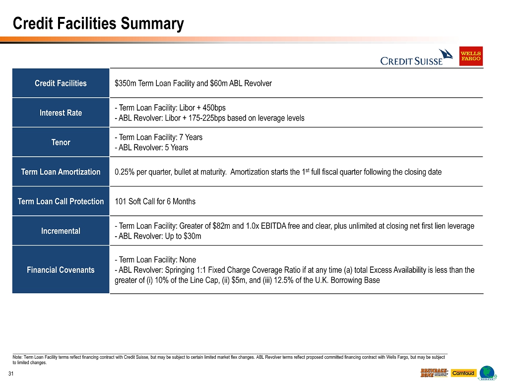 Credit Facilities $350m Term Loan Facility and $60m ABL Revolver Interest Rate - Term Loan Facility: Libor + 450bps - ABL Revolver: Libor + 175 - 225bps based on leverage levels Tenor - Term Loan Facility: 7 Years - ABL Revolver: 5 Years Term Loan Amortization 0.25% per quarter, bullet at maturity. Amortization starts the 1 st full fiscal quarter following the closing date Term Loan Call Protection 101 Soft Call for 6 Months Incremental - Term Loan Facility: Greater of $82m and 1.0x EBITDA free and clear, plus unlimited at closing net first lien leverage - ABL Revolver: Up to $30m Financial Covenants - Term Loan Facility: None - ABL Revolver: Springing 1:1 Fixed Charge Coverage Ratio if at any time (a) total Excess Availability is less than the greater of (i) 10% of the Line Cap, (ii) $5m, and (iii) 12.5% of the U.K. Borrowing Base Credit Facilities Summary 31 _____________________________________________________________________________________________________________________________ ___ _____________________________________________________________ Note: Term Loan Facility terms reflect financing contract with Credit Suisse, but may be subject to certain limited market fl ex changes. ABL Revolver terms reflect proposed committed financing contract with Wells Fargo, but may be subject to limited changes.
