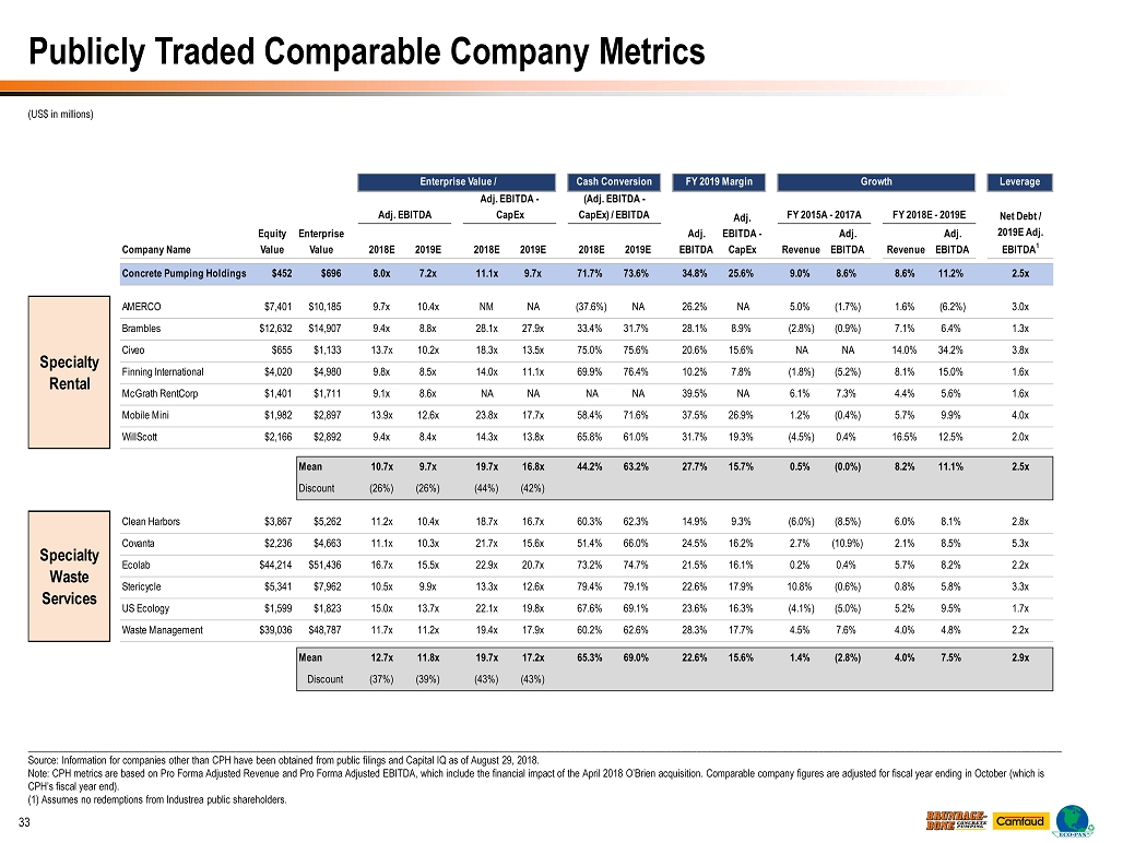 Publicly Traded Comparable Company Metrics 33 _____________________________________________________________________________________________________________________________ ___ ____________________________________________________________________________ Source: Information for companies other than CPH have been obtained from public filings and Capital IQ as of August 29, 2018. Note: CPH metrics are based on Pro Forma Adjusted Revenue and Pro Forma Adjusted EBITDA, which include the financial impact o f t he April 2018 O’Brien acquisition. Comparable company figures are adjusted for fiscal year ending in October (which is CPH’s fiscal year end). (1) Assumes no redemptions from Industrea public shareholders. (US$ in millions) Enterprise Value / Cash Conversion FY 2019 Margin Growth Leverage Adj. EBITDA Adj. EBITDA - CapEx (Adj. EBITDA - CapEx) / EBITDA FY 2015A - 2017A FY 2018E - 2019E Company Name Equity Value Enterprise Value 2018E 2019E 2018E 2019E 2018E 2019E Adj. EBITDA Revenue Adj. EBITDA Revenue Adj. EBITDA Concrete Pumping Holdings $452 $696 8.0x 7.2x 11.1x 9.7x 71.7% 73.6% 34.8% 25.6% 9.0% 8.6% 8.6% 11.2% 2.5x AMERCO $7,401 $10,185 9.7x 10.4x NM NA (37.6%) NA 26.2% NA 5.0% (1.7%) 1.6% (6.2%) 3.0x Brambles $12,632 $14,907 9.4x 8.8x 28.1x 27.9x 33.4% 31.7% 28.1% 8.9% (2.8%) (0.9%) 7.1% 6.4% 1.3x Civeo $655 $1,133 13.7x 10.2x 18.3x 13.5x 75.0% 75.6% 20.6% 15.6% NA NA 14.0% 34.2% 3.8x Finning International $4,020 $4,980 9.8x 8.5x 14.0x 11.1x 69.9% 76.4% 10.2% 7.8% (1.8%) (5.2%) 8.1% 15.0% 1.6x McGrath RentCorp $1,401 $1,711 9.1x 8.6x NA NA NA NA 39.5% NA 6.1% 7.3% 4.4% 5.6% 1.6x Mobile Mini $1,982 $2,897 13.9x 12.6x 23.8x 17.7x 58.4% 71.6% 37.5% 26.9% 1.2% (0.4%) 5.7% 9.9% 4.0x WillScott $2,166 $2,892 9.4x 8.4x 14.3x 13.8x 65.8% 61.0% 31.7% 19.3% (4.5%) 0.4% 16.5% 12.5% 2.0x Mean 10.7x 9.7x 19.7x 16.8x 44.2% 63.2% 27.7% 15.7% 0.5% (0.0%) 8.2% 11.1% 2.5x Discount (26%) (26%) (44%) (42%) Clean Harbors $3,867 $5,262 11.2x 10.4x 18.7x 16.7x 60.3% 62.3% 14.9% 9.3% (6.0%) (8.5%) 6.0% 8.1% 2.8x Covanta $2,236 $4,663 11.1x 10.3x 21.7x 15.6x 51.4% 66.0% 24.5% 16.2% 2.7% (10.9%) 2.1% 8.5% 5.3x Ecolab $44,214 $51,436 16.7x 15.5x 22.9x 20.7x 73.2% 74.7% 21.5% 16.1% 0.2% 0.4% 5.7% 8.2% 2.2x Stericycle $5,341 $7,962 10.5x 9.9x 13.3x 12.6x 79.4% 79.1% 22.6% 17.9% 10.8% (0.6%) 0.8% 5.8% 3.3x US Ecology $1,599 $1,823 15.0x 13.7x 22.1x 19.8x 67.6% 69.1% 23.6% 16.3% (4.1%) (5.0%) 5.2% 9.5% 1.7x Waste Management $39,036 $48,787 11.7x 11.2x 19.4x 17.9x 60.2% 62.6% 28.3% 17.7% 4.5% 7.6% 4.0% 4.8% 2.2x Mean 12.7x 11.8x 19.7x 17.2x 65.3% 69.0% 22.6% 15.6% 1.4% (2.8%) 4.0% 7.5% 2.9x Discount (37%) (39%) (43%) (43%) Specialty Rental Specialty Waste Services Adj. EBITDA - CapEx Net Debt / 2019E Adj. EBITDA 1