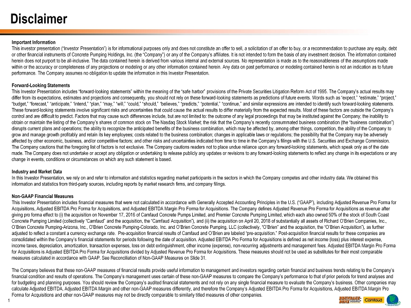 Important Information This investor presentation (“Investor Presentation”) is for informational purposes only and does not constitute an offer to s ell , a solicitation of an offer to buy, or a recommendation to purchase any equity, debt or other financial instruments of Concrete Pumping Holdings, Inc. (the “Company”) or any of the Company’s affiliates. It is n ot intended to form the basis of any investment decision. The information contained herein does not purport to be all - inclusive. The data contained herein is derived from various internal and external sources. No representation is made as to the reasonableness of the assumptions made within or the accuracy or completeness of any projections or modeling or any other information contained herein. Any data on pas t performance or modeling contained herein is not an indication as to future performance. The Company assumes no obligation to update the information in this Investor Presentation. Forward - Looking Statements This Investor Presentation includes “forward - looking statements” within the meaning of the “safe harbor” provisions of the Priva te Securities Litigation Reform Act of 1995. The Company’s actual results may differ from its expectations, estimates and projections and consequently, you should not rely on these forward - looking statement s as predictions of future events. Words such as “expect,” “estimate,” “project,” “budget,” “forecast,” “anticipate,” “intend,” “plan,” “may,” “will,” “could,” “should,” “believes,” “predicts,” “potential,” “co ntinue,” and similar expressions are intended to identify such forward - looking statements. These forward - looking statements involve significant risks and uncertainties that could cause the actual results to differ mater ially from the expected results. Most of these factors are outside the Company’s control and are difficult to predict. Factors that may cause such differences include, but are not limited to: the outcome of an y legal proceedings that may be instituted against the Company; the inability to obtain or maintain the listing of the Company’s shares of common stock on The Nasdaq Stock Market; the risk that the Company’ s r ecently consummated business combination (the “business combination”) disrupts current plans and operations; the ability to recognize the anticipated benefits of the business combination, which m ay be affected by, among other things, competition, the ability of the Company to grow and manage growth profitably and retain its key employees; costs related to the business combination; changes in applica ble laws or regulations; the possibility that the Company may be adversely affected by other economic, business, and/or competitive factors; and other risks and uncertainties indicated from time to ti me in the Company’s filings with the U.S. Securities and Exchange Commission. The Company cautions that the foregoing list of factors is not exclusive. The Company cautions readers not to place undue rel ian ce upon any forward - looking statements, which speak only as of the date made. The Company does not undertake or accept any obligation or undertaking to release publicly any updates or revisions to any forward - looking statements to reflect any change in its expectations or any change in events, conditions or circumstances on which any such statement is based. Industry and Market Data In this Investor Presentation, we rely on and refer to information and statistics regarding market participants in the sector s i n which the Company competes and other industry data. We obtained this information and statistics from third - party sources, including reports by market research firms, and company filings. Non - GAAP Financial Measures This Investor Presentation includes financial measures that were not calculated in accordance with Generally Accepted Accounting Principles in the U.S. (“ GAAP ”), including Adjusted Revenue Pro Forma for Acquisitions, Adjusted EBITDA Pro Forma for Acquisitions, and Adjusted EBITDA Margin Pro Forma for Acquisitions. The Company def ines Adjusted Revenue Pro Forma for Acquisitions as revenue after giving pro forma effect to (i) the acquisition on November 17, 2016 of Camfaud Concrete Pumps Limited, and Premier Concrete P ump ing Limited, which each also owned 50% of the stock of South Coast Concrete Pumping Limited (collectively “Camfaud” and the acquisition, the “Camfaud Acquisition”), and (ii) the acquisition on Ap ril 20, 2018 of substantially all assets of Richard O’Brien Companies, Inc., O’Brien Concrete Pumping - Arizona, Inc., O’Brien Concrete Pumping - Colorado, Inc. and O’Brien Concrete Pumping, LLC (collectively, “O’Brien” and the acquisition, the “O’Brien Acquisition”), as further adjusted to reflect a constant a currency exchange rate. Pre - acquisition financial results of Camfaud and O’Brien are labeled “pre - acquisition.” Post - acquisition financial results for t hese companies are consolidated within the Company’s financial statements for periods following the date of acquisition. Adjusted EBITDA Pro For ma for Acquisitions is defined as net income (loss) plus interest expense, income taxes, depreciation, amortization, transaction expenses, loss on debt extinguishment, other income (expense), non - recurri ng adjustments and management fees. Adjusted EBITDA Margin Pro Forma for Acquisitions is Adjusted EBITDA Pro Forma for Acquisitions divided by Adjusted Revenue Pro Forma for Acquisitions. These mea sures should not be used as substitutes for their most comparable measures calculated in accordance with GAAP. See Reconciliation of Non - GAAP Measures on Slide 31. The Company believes that these non - GAAP measures of financial results provide useful information to management and investors re garding certain financial and business trends relating to the Company’s financ