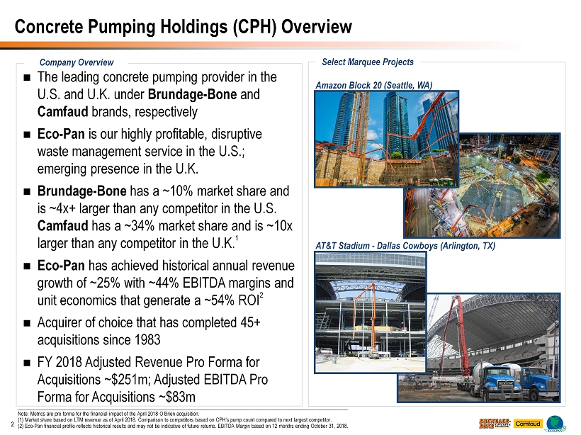 Important Information This investor presentation (“Investor Presentation”) is for informational purposes only and does not constitute an offer to s ell , a solicitation of an offer to buy, or a recommendation to purchase any equity, debt or other financial instruments of Concrete Pumping Holdings, Inc. (the “Company”) or any of the Company’s affiliates. It is n ot intended to form the basis of any investment decision. The information contained herein does not purport to be all - inclusive. The data contained herein is derived from various internal and external sources. No representation is made as to the reasonableness of the assumptions made within or the accuracy or completeness of any projections or modeling or any other information contained herein. Any data on pas t performance or modeling contained herein is not an indication as to future performance. The Company assumes no obligation to update the information in this Investor Presentation. Forward - Looking Statements This Investor Presentation includes “forward - looking statements” within the meaning of the “safe harbor” provisions of the Priva te Securities Litigation Reform Act of 1995. The Company’s actual results may differ from its expectations, estimates and projections and consequently, you should not rely on these forward - looking statement s as predictions of future events. Words such as “expect,” “estimate,” “project,” “budget,” “forecast,” “anticipate,” “intend,” “plan,” “may,” “will,” “could,” “should,” “believes,” “predicts,” “potential,” “co ntinue,” and similar expressions are intended to identify such forward - looking statements. These forward - looking statements involve significant risks and uncertainties that could cause the actual results to differ mater ially from the expected results. Most of these factors are outside the Company’s control and are difficult to predict. Factors that may cause such differences include, but are not limited to: the outcome of an y legal proceedings that may be instituted against the Company; the inability to obtain or maintain the listing of the Company’s shares of common stock on The Nasdaq Stock Market; the risk that the Company’ s r ecently consummated business combination (the “business combination”) disrupts current plans and operations; the ability to recognize the anticipated benefits of the business combination, which m ay be affected by, among other things, competition, the ability of the Company to grow and manage growth profitably and retain its key employees; costs related to the business combination; changes in applica ble laws or regulations; the possibility that the Company may be adversely affected by other economic, business, and/or competitive factors; and other risks and uncertainties indicated from time to ti me in the Company’s filings with the U.S. Securities and Exchange Commission. The Company cautions that the foregoing list of factors is not exclusive. The Company cautions readers not to place undue rel ian ce upon any forward - looking statements, which speak only as of the date made. The Company does not undertake or accept any obligation or undertaking to release publicly any updates or revisions to any forward - looking statements to reflect any change in its expectations or any change in events, conditions or circumstances on which any such statement is based. Industry and Market Data In this Investor Presentation, we rely on and refer to information and statistics regarding market participants in the sector s i n which the Company competes and other industry data. We obtained this information and statistics from third - party sources, including reports by market research firms, and company filings. Non - GAAP Financial Measures This Investor Presentation includes financial measures that were not calculated in accordance with Generally Accepted Accounting Principles in the U.S. (“ GAAP ”), including Adjusted Revenue Pro Forma for Acquisitions, Adjusted EBITDA Pro Forma for Acquisitions, and Adjusted EBITDA Margin Pro Forma for Acquisitions. The Company def ines Adjusted Revenue Pro Forma for Acquisitions as revenue after giving pro forma effect to (i) the acquisition on November 17, 2016 of Camfaud Concrete Pumps Limited, and Premier Concrete P ump ing Limited, which each also owned 50% of the stock of South Coast Concrete Pumping Limited (collectively “Camfaud” and the acquisition, the “Camfaud Acquisition”), and (ii) the acquisition on Ap ril 20, 2018 of substantially all assets of Richard O’Brien Companies, Inc., O’Brien Concrete Pumping - Arizona, Inc., O’Brien Concrete Pumping - Colorado, Inc. and O’Brien Concrete Pumping, LLC (collectively, “O’Brien” and the acquisition, the “O’Brien Acquisition”), as further adjusted to reflect a constant a currency exchange rate. Pre - acquisition financial results of Camfaud and O’Brien are labeled “pre - acquisition.” Post - acquisition financial results for t hese companies are consolidated within the Company’s financial statements for periods following the date of acquisition. Adjusted EBITDA Pro For ma for Acquisitions is defined as net income (loss) plus interest expense, income taxes, depreciation, amortization, transaction expenses, loss on debt extinguishment, other income (expense), non - recurri ng adjustments and management fees. Adjusted EBITDA Margin Pro Forma for Acquisitions is Adjusted EBITDA Pro Forma for Acquisitions divided by Adjusted Revenue Pro Forma for Acquisitions. These mea sures should not be used as substitutes for their most comparable measures calculated in accordance with GAAP. See Reconciliation of Non - GAAP Measures on Slide 31. The Company believes that these non - GAAP measures of financial results provide useful information to management and investors re garding certain financial and business trends relating to the Company’s financ