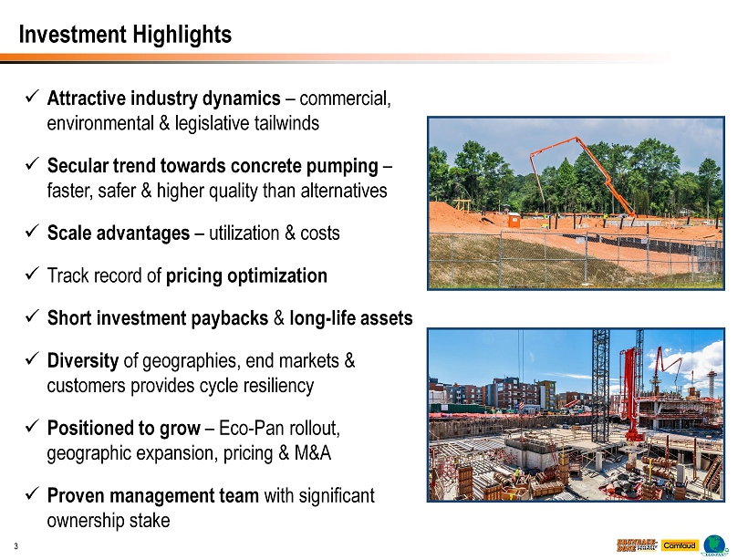 Concrete Pumping Holdings (CPH) Overview The leading concrete pumping provider in the U.S. and U.K. under Brundage - Bone and Camfaud brands, respectively Eco - Pan is our highly profitable, disruptive waste management service in the U.S.; emerging presence in the U.K. Brundage - Bone has a ~10% market share and is ~4x+ larger than any competitor in the U.S. Camfaud has a ~34% market share and is ~10x larger than any competitor in the U.K. 1 Eco - Pan has achieved historical annual revenue growth of ~25% with ~44% EBITDA margins and unit economics that generate a ~54% ROI 2 Acquirer of choice that has completed 45+ acquisitions since 1983 FY 2018 Adjusted Revenue Pro Forma for Acquisitions ~$251m; Adjusted EBITDA Pro Forma for Acquisitions ~$83m 2 Amazon Block 20 (Seattle, WA) AT&T Stadium - Dallas Cowboys (Arlington, TX) _____________________________________________________________________________________________________________________________ _ Note: Metrics are pro forma for the financial impact of the April 2018 O’Brien acquisition. (1) Market share based on LTM revenue as of April 2018. Comparison to competitors based on CPH’s pump count compared to next lar gest competitor. (2) Eco - Pan financial profile reflects historical results and may not be indicative of future returns. EBITDA Margin based on 12 months ending October 31, 2018. Select Marquee Projects Company Overview