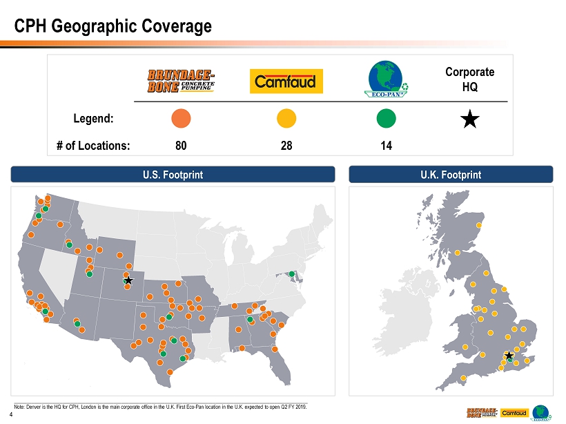 Important Information This investor presentation (“Investor Presentation”) is for informational purposes only and does not constitute an offer to s ell , a solicitation of an offer to buy, or a recommendation to purchase any equity, debt or other financial instruments of Concrete Pumping Holdings, Inc. (the “Company”) or any of the Company’s affiliates. It is n ot intended to form the basis of any investment decision. The information contained herein does not purport to be all - inclusive. The data contained herein is derived from various internal and external sources. No representation is made as to the reasonableness of the assumptions made within or the accuracy or completeness of any projections or modeling or any other information contained herein. Any data on pas t performance or modeling contained herein is not an indication as to future performance. The Company assumes no obligation to update the information in this Investor Presentation. Forward - Looking Statements This Investor Presentation includes “forward - looking statements” within the meaning of the “safe harbor” provisions of the Priva te Securities Litigation Reform Act of 1995. The Company’s actual results may differ from its expectations, estimates and projections and consequently, you should not rely on these forward - looking statement s as predictions of future events. Words such as “expect,” “estimate,” “project,” “budget,” “forecast,” “anticipate,” “intend,” “plan,” “may,” “will,” “could,” “should,” “believes,” “predicts,” “potential,” “co ntinue,” and similar expressions are intended to identify such forward - looking statements. These forward - looking statements involve significant risks and uncertainties that could cause the actual results to differ mater ially from the expected results. Most of these factors are outside the Company’s control and are difficult to predict. Factors that may cause such differences include, but are not limited to: the outcome of an y legal proceedings that may be instituted against the Company; the inability to obtain or maintain the listing of the Company’s shares of common stock on The Nasdaq Stock Market; the risk that the Company’ s r ecently consummated business combination (the “business combination”) disrupts current plans and operations; the ability to recognize the anticipated benefits of the business combination, which m ay be affected by, among other things, competition, the ability of the Company to grow and manage growth profitably and retain its key employees; costs related to the business combination; changes in applica ble laws or regulations; the possibility that the Company may be adversely affected by other economic, business, and/or competitive factors; and other risks and uncertainties indicated from time to ti me in the Company’s filings with the U.S. Securities and Exchange Commission. The Company cautions that the foregoing list of factors is not exclusive. The Company cautions readers not to place undue rel ian ce upon any forward - looking statements, which speak only as of the date made. The Company does not undertake or accept any obligation or undertaking to release publicly any updates or revisions to any forward - looking statements to reflect any change in its expectations or any change in events, conditions or circumstances on which any such statement is based. Industry and Market Data In this Investor Presentation, we rely on and refer to information and statistics regarding market participants in the sector s i n which the Company competes and other industry data. We obtained this information and statistics from third - party sources, including reports by market research firms, and company filings. Non - GAAP Financial Measures This Investor Presentation includes financial measures that were not calculated in accordance with Generally Accepted Accounting Principles in the U.S. (“ GAAP ”), including Adjusted Revenue Pro Forma for Acquisitions, Adjusted EBITDA Pro Forma for Acquisitions, and Adjusted EBITDA Margin Pro Forma for Acquisitions. The Company def ines Adjusted Revenue Pro Forma for Acquisitions as revenue after giving pro forma effect to (i) the acquisition on November 17, 2016 of Camfaud Concrete Pumps Limited, and Premier Concrete P ump ing Limited, which each also owned 50% of the stock of South Coast Concrete Pumping Limited (collectively “Camfaud” and the acquisition, the “Camfaud Acquisition”), and (ii) the acquisition on Ap ril 20, 2018 of substantially all assets of Richard O’Brien Companies, Inc., O’Brien Concrete Pumping - Arizona, Inc., O’Brien Concrete Pumping - Colorado, Inc. and O’Brien Concrete Pumping, LLC (collectively, “O’Brien” and the acquisition, the “O’Brien Acquisition”), as further adjusted to reflect a constant a currency exchange rate. Pre - acquisition financial results of Camfaud and O’Brien are labeled “pre - acquisition.” Post - acquisition financial results for t hese companies are consolidated within the Company’s financial statements for periods following the date of acquisition. Adjusted EBITDA Pro For ma for Acquisitions is defined as net income (loss) plus interest expense, income taxes, depreciation, amortization, transaction expenses, loss on debt extinguishment, other income (expense), non - recurri ng adjustments and management fees. Adjusted EBITDA Margin Pro Forma for Acquisitions is Adjusted EBITDA Pro Forma for Acquisitions divided by Adjusted Revenue Pro Forma for Acquisitions. These mea sures should not be used as substitutes for their most comparable measures calculated in accordance with GAAP. See Reconciliation of Non - GAAP Measures on Slide 31. The Company believes that these non - GAAP measures of financial results provide useful information to management and investors re garding certain financial and business trends relating to the Company’s financ