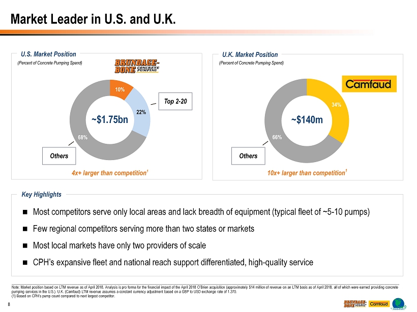 Market Leader in U.S. and U.K. U.S. Market Position (Percent of Concrete Pumping Spend) U.K. Market Position (Percent of Concrete Pumping Spend) 34% 66% ~$140m Others Key Highlights Most competitors serve only local areas and lack breadth of equipment (typical fleet of ~5 - 10 pumps) Few regional competitors serving more than two states or markets Most local markets have only two providers of scale CPH’s expansive fleet and national reach support differentiated, high - quality service 8 10% 22% 68% ~$1.75bn Others Top 2 - 20 _____________________________________________________________________________________________________________________________ ___ ______________________________________________________________________________ Note: Market position based on LTM revenue as of April 2018. Analysis is pro forma for the financial impact of the April 2018 O’ Brien acquisition (approximately $14 million of revenue on an LTM basis as of April 2018, all of which were earned providing con crete pumping services in the U.S.). U.K. (Camfaud) LTM revenue assumes a constant currency adjustment based on a GBP to USD exchan ge rate of 1.370. (1) Based on CPH’s pump count compared to next largest competitor. 4x+ larger than competition 1 10x+ larger than competition 1