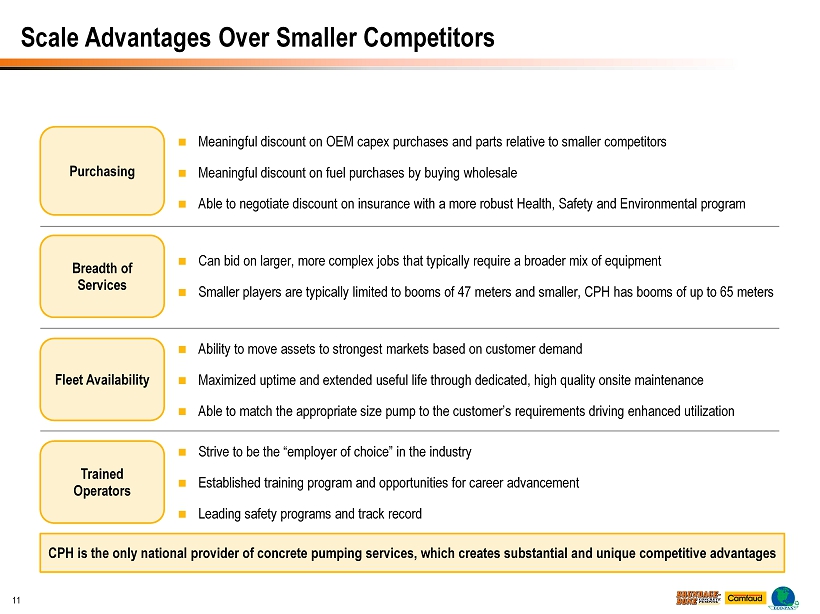 Key Advantages of Business Model Services provided on a hourly and yardage poured basis, and include invoicing a travel charge Surcharge for any additional costs (such as fuel) High percentage of repeat customers plus strong referral network Simple Bidding Process Pure service business that doesn’t take title of ready - mix concrete No raw material price exposure No product liability risk Limited Project Risk No fixed price bid work and no percentage of completion accounting The daily pour, not the total project, is what is billed Variable Cost base provides flexibility across business environments No Fixed Price Projects No letter of credit or bonding exposure No Surety Bonding Requirements Negligible bad debt expense historically Typically one of the first trade contractors paid on the job Company invoices customers each day as the work is performed Limited Bad Debt Exposure CPH’s business model avoids issues common to typical contractors and construction service providers 10