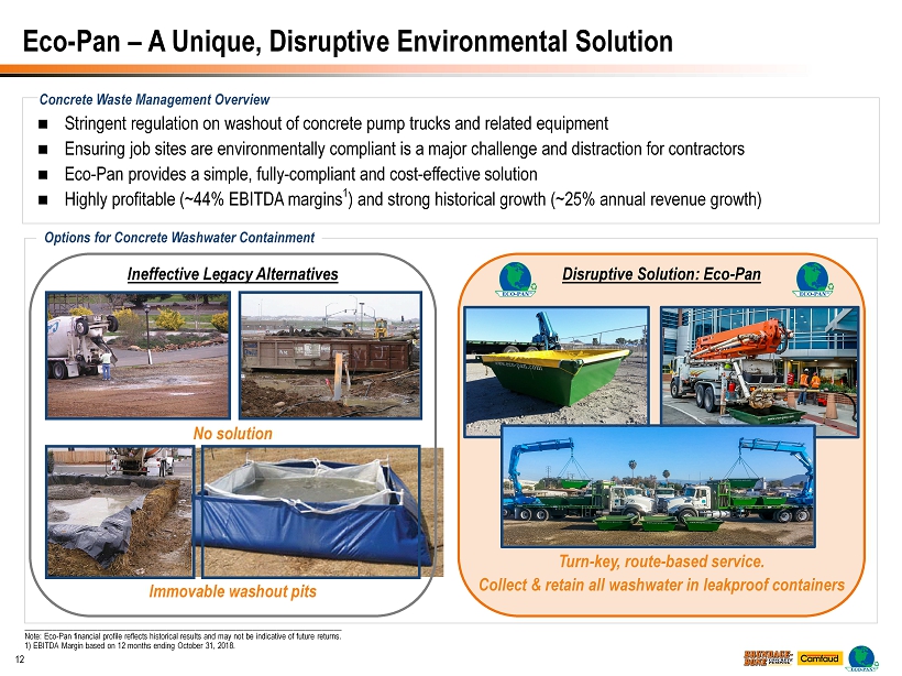 Eco - Pan – A Unique, Disruptive Environmental Solution ______________________________________________________________________________ Note: Eco - Pan financial profile reflects historical results and may not be indicative of future returns. 1) EBITDA Margin based on 12 months ending October 31, 2018. 12 Stringent regulation on washout of concrete pump trucks and related equipment Ensuring job sites are environmentally compliant is a major challenge and distraction for contractors Eco - Pan provides a simple, fully - compliant and cost - effective solution Highly profitable (~44% EBITDA margins 1 ) and strong historical growth (~25% annual revenue growth) Concrete Waste Management Overview Options for Concrete Washwater Containment Immovable washout pits Turn - key, route - based service. Collect & retain all washwater in leakproof containers No solution Ineffective Legacy Alternatives Disruptive Solution: Eco - Pan