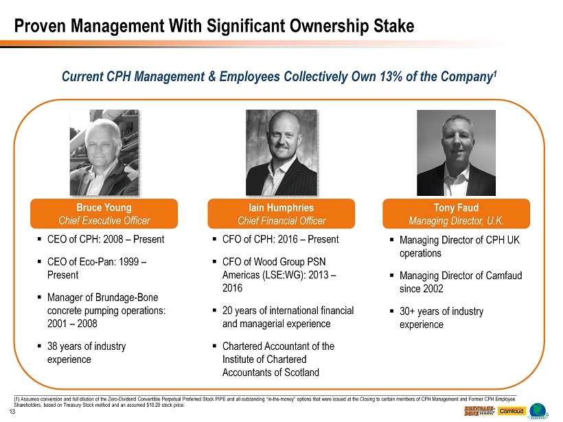 Bruce Young Chief Executive Officer ▪ CEO of CPH: 2008 – Present ▪ CEO of Eco - Pan: 1999 – Present ▪ Manager of Brundage - Bone concrete pumping operations: 2001 – 2008 ▪ 38 years of industry experience ▪ CFO of CPH: 2016 – Present ▪ CFO of Wood Group PSN Americas (LSE:WG): 2013 – 2016 ▪ 20 years of international financial and managerial experience ▪ Chartered Accountant of the Institute of Chartered Accountants of Scotland Proven Management With Significant Ownership Stake Iain Humphries Chief Financial Officer 13 ▪ Managing Director of CPH UK operations ▪ Managing Director of Camfaud since 2002 ▪ 30+ years of industry experience Tony Faud Managing Director, U.K. Current CPH Management & Employees Collectively Own 13% of the Company 1 _____________________________________________________________________________________________________________________________ ___ ______________________________________________________________________ (1) Assumes conversion and full dilution of the Zero - Dividend Convertible Perpetual Preferred Stock PIPE and all outstanding “in - the - money” options that were issued at the Closing to certain members of CPH Management and Former CPH Employee Shareholders, based on Treasury Stock method and an assumed $10.20 stock price.