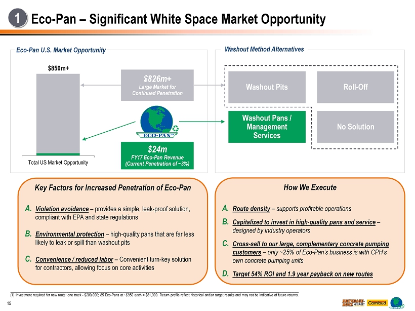 4 3 2 Framing the CPH Growth Opportunity 1 Scalable platform that is positioned for continued strong organic and strategic growth Expand Eco - Pan Pursue Acquisitions Capture Greater Market Share Optimize Pricing 14