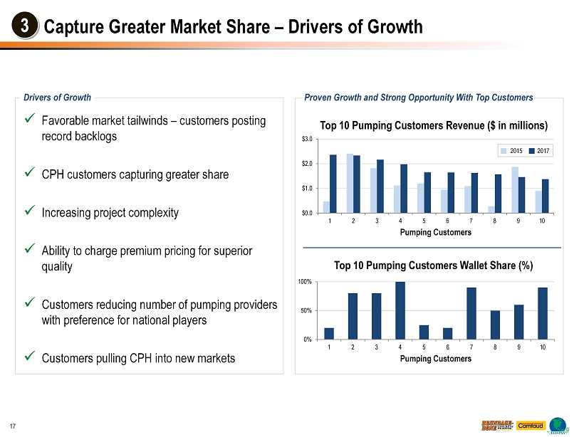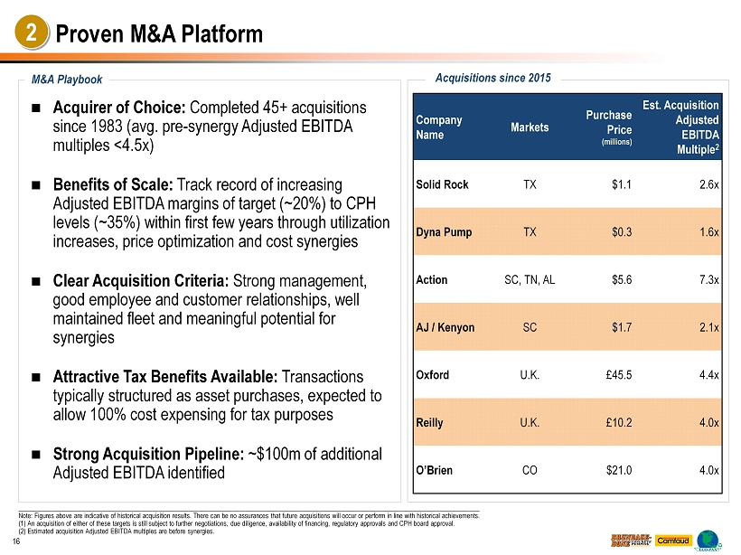 Acquirer of Choice: Completed 45+ acquisitions since 1983 (avg. pre - synergy Adjusted EBITDA multiples <4.5x) Benefits of Scale: Track record of increasing Adjusted EBITDA margins of target (~20%) to CPH levels (~35%) within first few years through utilization increases, price optimization and cost synergies Clear Acquisition Criteria: Strong management, good employee and customer relationships, well maintained fleet and meaningful potential for synergies Attractive Tax Benefits Available: Transactions typically structured as asset purchases, expected to allow 100% cost expensing for tax purposes Strong Acquisition Pipeline: ~$100m of additional Adjusted EBITDA identified Proven M&A Platform 2 _____________________________________________________________________________________________________________________________ ___ __________ Note: Figures above are indicative of historical acquisition results. There can be no assurances that future acquisitions wil l o ccur or perform in line with historical achievements. (1) An acquisition of either of these targets is still subject to further negotiations, due diligence, availability of financ ing , regulatory approvals and CPH board approval. (2) Estimated acquisition Adjusted EBITDA multiples are before synergies. 16 Company Name Markets Purchase Price (millions) Est. Acquisition Adjusted EBITDA Multiple 2 Solid Rock TX $1.1 2.6x Dyna Pump TX $0.3 1.6x Action SC, TN, AL $5.6 7.3x AJ / Kenyon SC $1.7 2.1x Oxford U.K. £ 45.5 4.4x Reilly U.K. £ 10.2 4.0x O’Brien CO $21.0 4.0x M&A Playbook Acquisitions since 2015