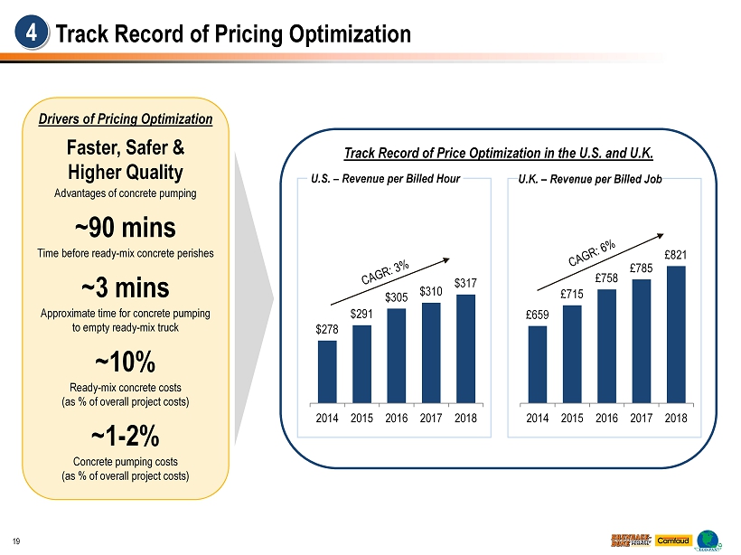 Capture Greater Market Share – Large Opportunities in U.S. & U.K. 18 $77 billion HS2 project Highly concrete intensive, with a very large percentage requiring pumping CPH’s U.K. segment (Camfaud) is well positioned to receive a large share given its national footprint and fleet capabilities Expected Contribution – Phase 1 Only: – ~5.4 million m 3 of concrete and ~2.2 million m 3 of which will be pumped – Phase 1 market opportunity for Camfaud could be worth up to $24 million __________________________________________________________________________________________________________ (1) American Society of Civil Engineers “2017 Infrastructure Report Card: A Comprehensive Assessment of America’s Infrastruct ure ”. U.K. High Speed Railway Project (“HS2”) Manchester Birmingham London Leeds Sheffield Key HS2 Phase 1 HS2 Phase 2 Project Overview U.S. State Infrastructure Report and Grading 1 U.S. Infrastructure Report and Grading 1 3 Category Grade 1 Aviation D 2 Bridges C+ 3 Dams D 4 Drinking Water D 5 Energy D+ 6 Hazardous Waste D+ 7 Inland Waterways D 8 Levees D 9 Parks & Recreation D+ 10 Ports C+ 11 Rail B 12 Roads D 13 Schools D+ 14 Solid Waste C+ 15 Transit D - 16 Wastewater D+ Overall D+ Significant investment ($1+ trillion over ten years) expected to address aging and poor state of U.S. infrastructure Brundage - Bone’s footprint and operational capabilities position it well to capture a large share of stimulus spend U.S. Infrastructure Stimulus Opportunity