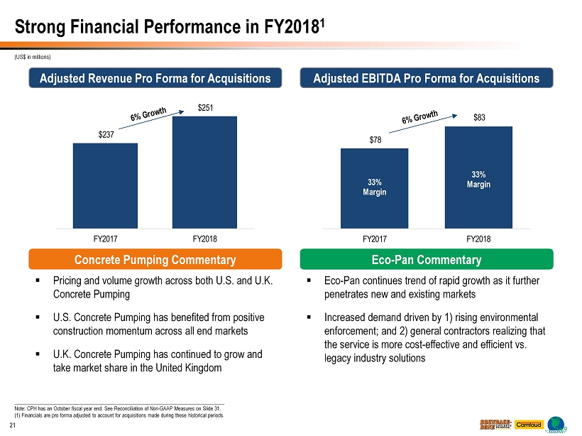 Important Information This investor presentation (“Investor Presentation”) is for informational purposes only and does not constitute an offer to s ell , a solicitation of an offer to buy, or a recommendation to purchase any equity, debt or other financial instruments of Concrete Pumping Holdings, Inc. (the “Company”) or any of the Company’s affiliates. It is n ot intended to form the basis of any investment decision. The information contained herein does not purport to be all - inclusive. The data contained herein is derived from various internal and external sources. No representation is made as to the reasonableness of the assumptions made within or the accuracy or completeness of any projections or modeling or any other information contained herein. Any data on pas t performance or modeling contained herein is not an indication as to future performance. The Company assumes no obligation to update the information in this Investor Presentation. Forward - Looking Statements This Investor Presentation includes “forward - looking statements” within the meaning of the “safe harbor” provisions of the Priva te Securities Litigation Reform Act of 1995. The Company’s actual results may differ from its expectations, estimates and projections and consequently, you should not rely on these forward - looking statement s as predictions of future events. Words such as “expect,” “estimate,” “project,” “budget,” “forecast,” “anticipate,” “intend,” “plan,” “may,” “will,” “could,” “should,” “believes,” “predicts,” “potential,” “co ntinue,” and similar expressions are intended to identify such forward - looking statements. These forward - looking statements involve significant risks and uncertainties that could cause the actual results to differ mater ially from the expected results. Most of these factors are outside the Company’s control and are difficult to predict. Factors that may cause such differences include, but are not limited to: the outcome of an y legal proceedings that may be instituted against the Company; the inability to obtain or maintain the listing of the Company’s shares of common stock on The Nasdaq Stock Market; the risk that the Company’ s r ecently consummated business combination (the “business combination”) disrupts current plans and operations; the ability to recognize the anticipated benefits of the business combination, which m ay be affected by, among other things, competition, the ability of the Company to grow and manage growth profitably and retain its key employees; costs related to the business combination; changes in applica ble laws or regulations; the possibility that the Company may be adversely affected by other economic, business, and/or competitive factors; and other risks and uncertainties indicated from time to ti me in the Company’s filings with the U.S. Securities and Exchange Commission. The Company cautions that the foregoing list of factors is not exclusive. The Company cautions readers not to place undue rel ian ce upon any forward - looking statements, which speak only as of the date made. The Company does not undertake or accept any obligation or undertaking to release publicly any updates or revisions to any forward - looking statements to reflect any change in its expectations or any change in events, conditions or circumstances on which any such statement is based. Industry and Market Data In this Investor Presentation, we rely on and refer to information and statistics regarding market participants in the sector s i n which the Company competes and other industry data. We obtained this information and statistics from third - party sources, including reports by market research firms, and company filings. Non - GAAP Financial Measures This Investor Presentation includes financial measures that were not calculated in accordance with Generally Accepted Accounting Principles in the U.S. (“ GAAP ”), including Adjusted Revenue Pro Forma for Acquisitions, Adjusted EBITDA Pro Forma for Acquisitions, and Adjusted EBITDA Margin Pro Forma for Acquisitions. The Company def ines Adjusted Revenue Pro Forma for Acquisitions as revenue after giving pro forma effect to (i) the acquisition on November 17, 2016 of Camfaud Concrete Pumps Limited, and Premier Concrete P ump ing Limited, which each also owned 50% of the stock of South Coast Concrete Pumping Limited (collectively “Camfaud” and the acquisition, the “Camfaud Acquisition”), and (ii) the acquisition on Ap ril 20, 2018 of substantially all assets of Richard O’Brien Companies, Inc., O’Brien Concrete Pumping - Arizona, Inc., O’Brien Concrete Pumping - Colorado, Inc. and O’Brien Concrete Pumping, LLC (collectively, “O’Brien” and the acquisition, the “O’Brien Acquisition”), as further adjusted to reflect a constant a currency exchange rate. Pre - acquisition financial results of Camfaud and O’Brien are labeled “pre - acquisition.” Post - acquisition financial results for t hese companies are consolidated within the Company’s financial statements for periods following the date of acquisition. Adjusted EBITDA Pro For ma for Acquisitions is defined as net income (loss) plus interest expense, income taxes, depreciation, amortization, transaction expenses, loss on debt extinguishment, other income (expense), non - recurri ng adjustments and management fees. Adjusted EBITDA Margin Pro Forma for Acquisitions is Adjusted EBITDA Pro Forma for Acquisitions divided by Adjusted Revenue Pro Forma for Acquisitions. These mea sures should not be used as substitutes for their most comparable measures calculated in accordance with GAAP. See Reconciliation of Non - GAAP Measures on Slide 31. The Company believes that these non - GAAP measures of financial results provide useful information to management and investors re garding certain financial and business trends relating to the Company’s financ