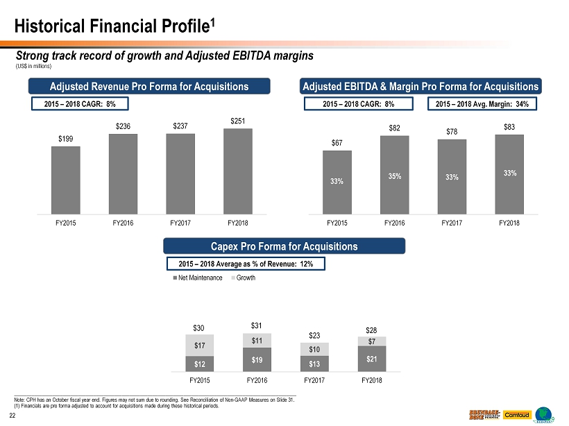 Strong Financial Performance in FY2018 1 21 Concrete Pumping Commentary ▪ Pricing and volume growth across both U.S. and U.K. Concrete Pumping ▪ U.S. Concrete Pumping has benefited from positive construction momentum across all end markets ▪ U.K. Concrete Pumping has continued to grow and take market share in the United Kingdom Adjusted Revenue Pro Forma for Acquisitions Adjusted EBITDA Pro Forma for Acquisitions ________________________________________________________________________________ Note: CPH has an October fiscal year end. See Reconciliation of Non - GAAP Measures on Slide 31. (1) Financials are pro forma adjusted to account for acquisitions made during these historical periods. ▪ Eco - Pan continues trend of rapid growth as it further penetrates new and existing markets ▪ Increased demand driven by 1) rising environmental enforcement; and 2) general contractors realizing that the service is more cost - effective and efficient vs. legacy industry solutions (US$ in millions) Eco - Pan Commentary $237 $251 FY2017 FY2018 $78 $83 FY2017 FY2018 33% Margin 33% Margin