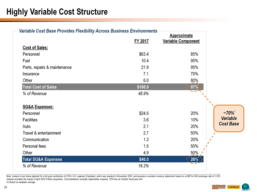 $12 $19 $13 $21 $17 $11 $10 $7 FY2015 FY2016 FY2017 FY2018 Net Maintenance Growth ______________________________________________________________________________________________________________ Note: CPH has an October fiscal year end. Figures may not sum due to rounding. See Reconciliation of Non - GAAP Measures on Slide 31. (1) Financials are pro forma adjusted to account for acquisitions made during these historical periods. $67 $82 $78 $83 FY2015 FY2016 FY2017 FY2018 $199 $236 $237 $251 FY2015 FY2016 FY2017 FY2018 Adjusted Revenue Pro Forma for Acquisitions Adjusted EBITDA & Margin Pro Forma for Acquisitions Capex Pro Forma for Acquisitions 2015 – 2018 CAGR: 8% 2015 – 2018 CAGR: 8% 2015 – 2018 Average as % of Revenue: 12% 33% 35% 33% 33% Historical Financial Profile 1 22 $31 $23 $28 Strong track record of growth and Adjusted EBITDA margins 2015 – 2018 Avg. Margin: 34% $30 (US$ in millions)