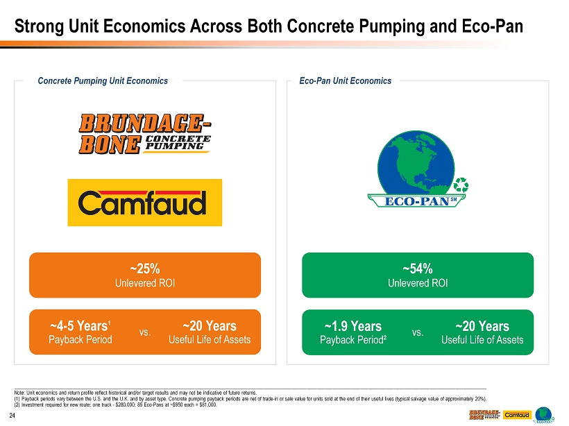 Strong Unit Economics Across Both Concrete Pumping and Eco - Pan 24 _____________________________________________________________________________________________________________________________ ___ ________________________________________________________ Note: Unit economics and return profile reflect historical and/or target results and may not be indicative of future returns. (1) Payback periods vary between the U.S. and the U.K. and by asset type. Concrete pumping payback periods are net of trade - in or sa le value for units sold at the end of their useful lives (typical salvage value of approximately 20%). (2) Investment required for new route: one truck - $280,000; 85 Eco - Pans at ~$950 each = $81,000. Concrete Pumping Unit Economics Eco - Pan Unit Economics ~54% Unlevered ROI vs. ~25% Unlevered ROI vs. ~4 - 5 Years 1 Payback Period ~20 Years Useful Life of Assets ~1.9 Years Payback Period² ~20 Years Useful Life of Assets