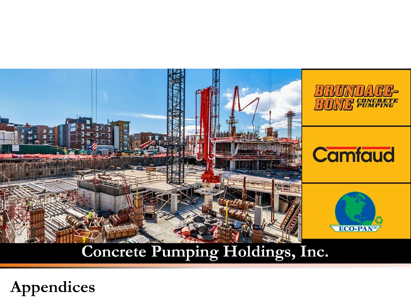 Important Information This investor presentation (“Investor Presentation”) is for informational purposes only and does not constitute an offer to s ell , a solicitation of an offer to buy, or a recommendation to purchase any equity, debt or other financial instruments of Concrete Pumping Holdings, Inc. (the “Company”) or any of the Company’s affiliates. It is n ot intended to form the basis of any investment decision. The information contained herein does not purport to be all - inclusive. The data contained herein is derived from various internal and external sources. No representation is made as to the reasonableness of the assumptions made within or the accuracy or completeness of any projections or modeling or any other information contained herein. Any data on pas t performance or modeling contained herein is not an indication as to future performance. The Company assumes no obligation to update the information in this Investor Presentation. Forward - Looking Statements This Investor Presentation includes “forward - looking statements” within the meaning of the “safe harbor” provisions of the Priva te Securities Litigation Reform Act of 1995. The Company’s actual results may differ from its expectations, estimates and projections and consequently, you should not rely on these forward - looking statement s as predictions of future events. Words such as “expect,” “estimate,” “project,” “budget,” “forecast,” “anticipate,” “intend,” “plan,” “may,” “will,” “could,” “should,” “believes,” “predicts,” “potential,” “co ntinue,” and similar expressions are intended to identify such forward - looking statements. These forward - looking statements involve significant risks and uncertainties that could cause the actual results to differ mater ially from the expected results. Most of these factors are outside the Company’s control and are difficult to predict. Factors that may cause such differences include, but are not limited to: the outcome of an y legal proceedings that may be instituted against the Company; the inability to obtain or maintain the listing of the Company’s shares of common stock on The Nasdaq Stock Market; the risk that the Company’ s r ecently consummated business combination (the “business combination”) disrupts current plans and operations; the ability to recognize the anticipated benefits of the business combination, which m ay be affected by, among other things, competition, the ability of the Company to grow and manage growth profitably and retain its key employees; costs related to the business combination; changes in applica ble laws or regulations; the possibility that the Company may be adversely affected by other economic, business, and/or competitive factors; and other risks and uncertainties indicated from time to ti me in the Company’s filings with the U.S. Securities and Exchange Commission. The Company cautions that the foregoing list of factors is not exclusive. The Company cautions readers not to place undue rel ian ce upon any forward - looking statements, which speak only as of the date made. The Company does not undertake or accept any obligation or undertaking to release publicly any updates or revisions to any forward - looking statements to reflect any change in its expectations or any change in events, conditions or circumstances on which any such statement is based. Industry and Market Data In this Investor Presentation, we rely on and refer to information and statistics regarding market participants in the sector s i n which the Company competes and other industry data. We obtained this information and statistics from third - party sources, including reports by market research firms, and company filings. Non - GAAP Financial Measures This Investor Presentation includes financial measures that were not calculated in accordance with Generally Accepted Accounting Principles in the U.S. (“ GAAP ”), including Adjusted Revenue Pro Forma for Acquisitions, Adjusted EBITDA Pro Forma for Acquisitions, and Adjusted EBITDA Margin Pro Forma for Acquisitions. The Company def ines Adjusted Revenue Pro Forma for Acquisitions as revenue after giving pro forma effect to (i) the acquisition on November 17, 2016 of Camfaud Concrete Pumps Limited, and Premier Concrete P ump ing Limited, which each also owned 50% of the stock of South Coast Concrete Pumping Limited (collectively “Camfaud” and the acquisition, the “Camfaud Acquisition”), and (ii) the acquisition on Ap ril 20, 2018 of substantially all assets of Richard O’Brien Companies, Inc., O’Brien Concrete Pumping - Arizona, Inc., O’Brien Concrete Pumping - Colorado, Inc. and O’Brien Concrete Pumping, LLC (collectively, “O’Brien” and the acquisition, the “O’Brien Acquisition”), as further adjusted to reflect a constant a currency exchange rate. Pre - acquisition financial results of Camfaud and O’Brien are labeled “pre - acquisition.” Post - acquisition financial results for t hese companies are consolidated within the Company’s financial statements for periods following the date of acquisition. Adjusted EBITDA Pro For ma for Acquisitions is defined as net income (loss) plus interest expense, income taxes, depreciation, amortization, transaction expenses, loss on debt extinguishment, other income (expense), non - recurri ng adjustments and management fees. Adjusted EBITDA Margin Pro Forma for Acquisitions is Adjusted EBITDA Pro Forma for Acquisitions divided by Adjusted Revenue Pro Forma for Acquisitions. These mea sures should not be used as substitutes for their most comparable measures calculated in accordance with GAAP. See Reconciliation of Non - GAAP Measures on Slide 31. The Company believes that these non - GAAP measures of financial results provide useful information to management and investors re garding certain financial and business trends relating to the Company’s financ