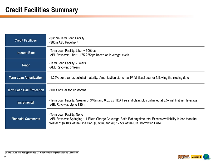 Credit Facilities - $357m Term Loan Facility - $60m ABL Revolver 1 Interest Rate - Term Loan Facility: Libor + 600bps - ABL Revolver: Libor + 175 - 225bps based on leverage levels Tenor - Term Loan Facility: 7 Years - ABL Revolver: 5 Years Term Loan Amortization - 1.25% per quarter, bullet at maturity. Amortization starts the 1 st full fiscal quarter following the closing date Term Loan Call Protection - 101 Soft Call for 12 Months Incremental - Term Loan Facility: Greater of $40m and 0.5x EBITDA free and clear, plus unlimited at 3.5x net first lien leverage - ABL Revolver: Up to $30m Financial Covenants - Term Loan Facility: None - ABL Revolver: Springing 1:1 Fixed Charge Coverage Ratio if at any time total Excess Availability is less than the greater of (i) 10% of the Line Cap, (ii) $5m, and (iii) 12.5% of the U.K. Borrowing Base Credit Facilities Summary 27 ____________________________________________________________________________ (1) The ABL balance was approximately $11 million at the closing of the Business Combination.