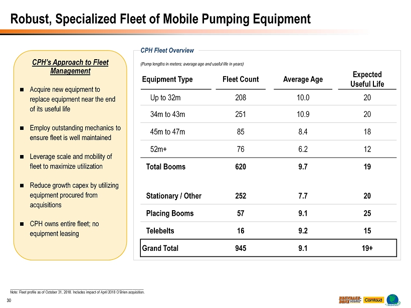 Robust, Specialized Fleet of Mobile Pumping Equipment 30 ________________________________________________________________________ Note: Fleet profile as of October 31, 2018. Includes impact of April 2018 O’Brien acquisition. CPH’s Approach to Fleet Management Acquire new equipment to replace equipment near the end of its useful life Employ outstanding mechanics to ensure fleet is well maintained Leverage scale and mobility of fleet to maximize utilization Reduce growth capex by utilizing equipment procured from acquisitions CPH owns entire fleet; no equipment leasing (Pump lengths in meters; average age and useful life in years) Equipment Type Fleet Count Average Age Expected Useful Life Up to 32m 208 10.0 20 34m to 43m 251 10.9 20 45m to 47m 85 8.4 18 52m+ 76 6.2 12 Total Booms 620 9.7 19 Stationary / Other 252 7.7 20 Placing Booms 57 9.1 25 Telebelts 16 9.2 15 Grand Total 945 9.1 19+ CPH Fleet Overview