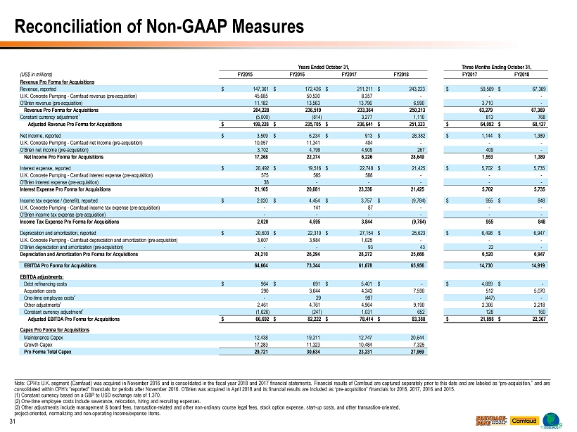 Reconciliation of Non - GAAP Measures 31 _____________________________________________________________________________________________________________________________ ___ ______________________________________________________________________________ Note: CPH’s U.K. segment (Camfaud) was acquired in November 2016 and is consolidated in the fiscal year 2018 and 2017 financi al statements. Financial results of Camfaud are captured separately prior to this date and are labeled as “pre - acquisition,” and ar e consolidated within CPH’s "reported" financials for periods after November 2016. O'Brien was acquired in April 2018 and its f ina ncial results are included as “pre - acquisition” financials for 2018, 2017, 2016 and 2015. (1) Constant currency based on a GBP to USD exchange rate of 1.370. (2) One - time employee costs include severance, relocation, hiring and recruiting expenses. (3) Other adjustments include management & board fees, transaction - related and other non - ordinary course legal fees, stock optio n expense, start - up costs, and other transaction - oriented, project - oriented, normalizing and non - operating income/expense items. Years Ended October 31, Three Months Ending October 31, (US$ in millions) FY2015 FY2016 FY2017 FY2018 FY2017 FY2018 Revenue Pro Forma for Acquisitions Revenue, reported $ 147,361 $ 172,426 $ 211,211 $ 243,223 $ 59,569 $ 67,369 U.K. Concrete Pumping - Camfaud revenue (pre-acquisition) 45,685 50,530 8,357 - - - O'Brien revenue (pre-acquisition) 11,182 13,563 13,796 6,990 3,710 - Revenue Pro Forma for Acquisitions 204,228 236,519 233,364 250,213 63,279 67,369 Constant currency adjustment 1 (5,000) (814) 3,277 1,110 813 768 Adjusted Revenue Pro Forma for Acquisitions $ 199,228 $ 235,705 $ 236,641 $ 251,323 $ 64,092 $ 68,137 Net income, reported $ 3,509 $ 6,234 $ 913 $ 28,382 $ 1,144 $ 1,389 U.K. Concrete Pumping - Camfaud net income (pre-acquisition) 10,057 11,341 404 - - - O'Brien net income (pre-acquisition) 3,702 4,799 4,909 267 409 - Net Income Pro Forma for Acquisitions 17,268 22,374 6,226 28,649 1,553 1,389 Interest expense, reported $ 20,492 $ 19,516 $ 22,748 $ 21,425 $ 5,702 $ 5,735 U.K. Concrete Pumping - Camfaud interest expense (pre-acquisition) 575 565 588 - - - O'Brien interest expense (pre-acquisition) 38 - - - - - Interest Expense Pro Forma for Acquisitions 21,105 20,081 23,336 21,425 5,702 5,735 Income tax expense / (benefit), reported $ 2,020 $ 4,454 $ 3,757 $ (9,784) $ 955 $ 848 U.K. Concrete Pumping - Camfaud income tax expense (pre-acquisition) - 141 87 - - - O'Brien income tax expense (pre-acquisition) - - - - - - Income Tax Expense Pro Forma for Acquisitions 2,020 4,595 3,844 (9,784) 955 848 Depreciation and amortization, reported $ 20,603 $ 22,310 $ 27,154 $ 25,623 $ 6,498 $ 6,947 U.K. Concrete Pumping - Camfaud depreciation and amortization (pre-acquisition) 3,607 3,984 1,025 - - - O'Brien depreciation and amortization (pre-acquisition) - - 93 43 22 - Depreciation and Amortization Pro Forma for Acquisitions 24,210 26,294 28,272 25,666 6,520 6,947 EBITDA Pro Forma for Acquisitions 64,604 73,344 61,678 65,956 14,730 14,919 EBITDA adjustments: Debt refinancing costs $ 964 $ 691 $ 5,401 $ - $ 4,669 $ - Acquisition costs 290 3,644 4,343 7,590 512 5,070 One-time employee costs 2 - 29 997 - (447) - Other adjustments 3 2,461 4,761 4,964 9,190 2,306 2,218 Constant currency adjustment 1 (1,626) (247) 1,031 652 128 160 Adjusted EBITDA Pro Forma for Acquisitions $ 66,692 $ 82,222 $ 78,414 $ 83,388 $ 21,898 $ 22,367 Capex Pro Forma for Acquisitions Maintenance Capex 12,438 19,311 12,747 20,644 Growth Capex 17,283 11,323 10,484 7,325 Pro Forma Total Capex 29,721 30,634 23,231 27,969