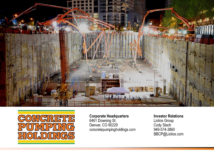 Corporate Headquarters Investor Relations 6461 Downing St. Liolios Group Denver, CO 80229 Cody Slach concretepumpingholdings.com 949 - 574 - 3860 BBCP@Liolios.com
