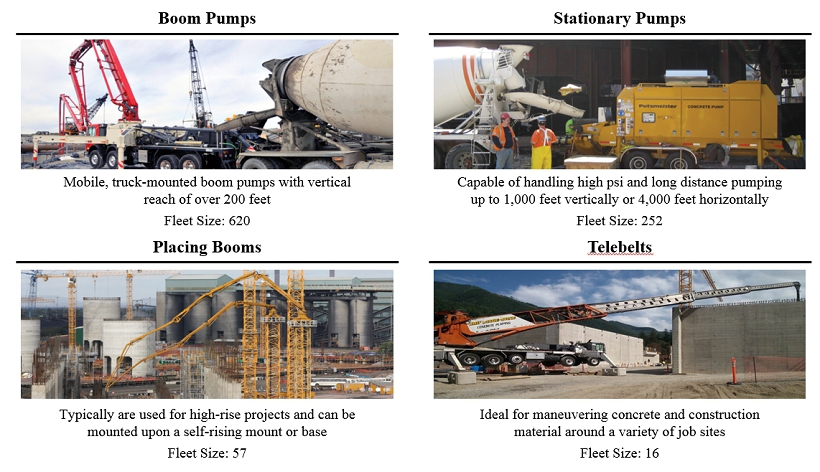 U.S. Concrete Pumping — Brundage-Bone: CPH provides concrete pumping services in the U.S. with a fleet of 584 equipment units from a diversified footprint of 80 locations across 22 states as of October 31, 2018 and operates under the brand Brundage-Bone. CPH provides operated concrete pumping services, for which CPH bills customers on a negotiated time and volume basis based on the duration of the job and yards of concrete pumped. Additional charges (such as a fuel surcharge and travel costs) are frequently added based on the local market competitive environment and specific project requirements. Typically, CPH sends a single operator with each concrete pump. CPH does not take ownership of the concrete and thus has minimal inventory or product liability risk. CPH typically does not engage in fixed-bid work or have surety bonding requirements. CPH operates a daily fee-based revenue model regardless of project completion. Brundage-Bone is a leading provider of concrete pumping services in the U.S. based on fleet size and the only competitor with a multi-regional footprint in a highly fragmented industry. CPH’s large fleet of specialized pumping equipment and highly-trained operators position CPH to deliver concrete placement solutions that we believe facilitate substantial labor cost savings to its customers, shorten concrete placement times, enhance worksite safety and improve construction quality. CPH has actively positioned the Brundage-Bone business towards commercial and infrastructure construction projects, while continuing to pursue profitable residential opportunities.