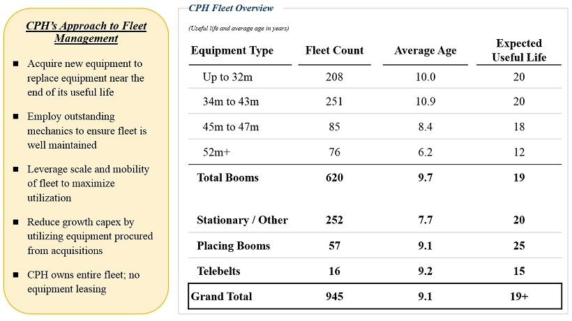 CPH’s fleet is operated by approximately 657 experienced employees as of October 31, 2018, each of whom is required to complete rigorous training and safety programs. As of October 31, 2018, CPH’s fleet of 945 total pieces of equipment consisted of 620 boom pumps, ranging in size from 17 to 65 meters, 57 placing booms, 16 telebelts and 252 stationary pumps and other specialized concrete placing equipment. CPH maintains the flexibility to move assets between branches depending on market conditions. CPH performs substantially all of its repair and maintenance work in-house through a staff of 92 mechanics so as to maximize fleet availability and performance levels. CPH operators are paid on an hourly basis and only when they are deployed on jobs, demonstrating CPH’s commitment to comprehensive and disciplined labor cost management. We estimate that 70% of CPH’s total costs are variable.